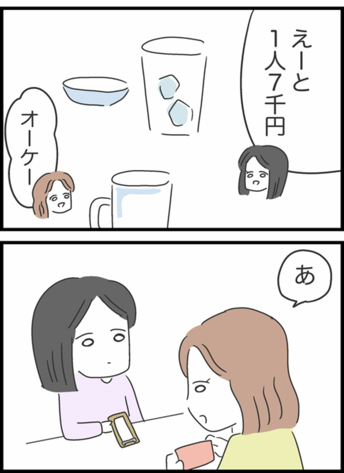 お店の閉店時間となり、お会計をする様子。1人7千円の支払いですが、りかが何かに気づいたようですね。