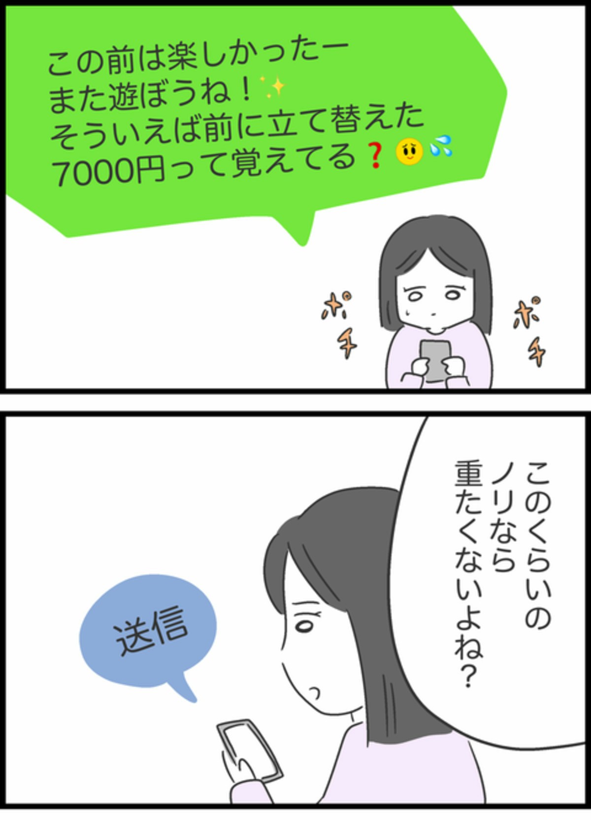 すみれは高校時代の友人・りかに「飲み代を立て替えてほしい」と頼まれ、深く考えずにお金を貸します。しかし約束したはずのお金はなかなか返ってこず、催促もできないままモヤモヤを抱えることに。