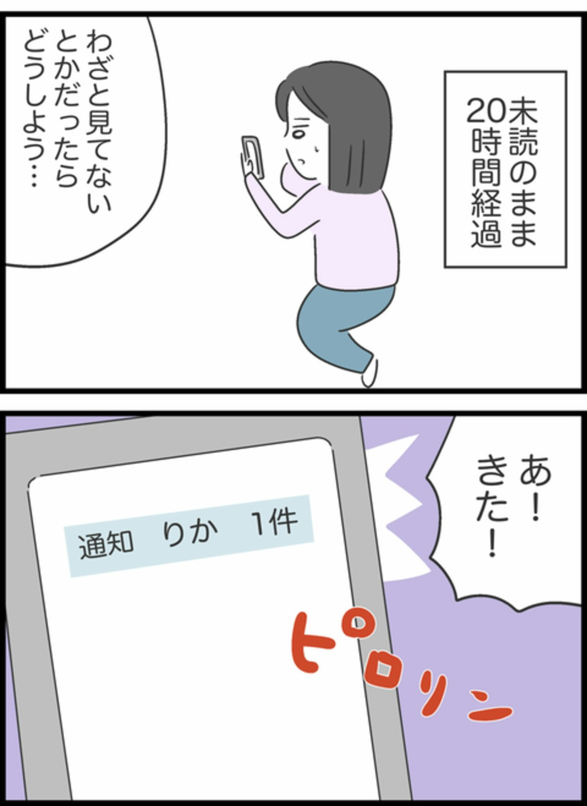 深刻に受け取られないように文面に気をつけながらりかにメールを送ったすみれ。しかし、未読のまま時間だけが過ぎていき不安がつのります。20時間後、りかからの返信には忘れていたという内容が書かれていました。それを読み、すみれは胸を撫でおろしたのでした。