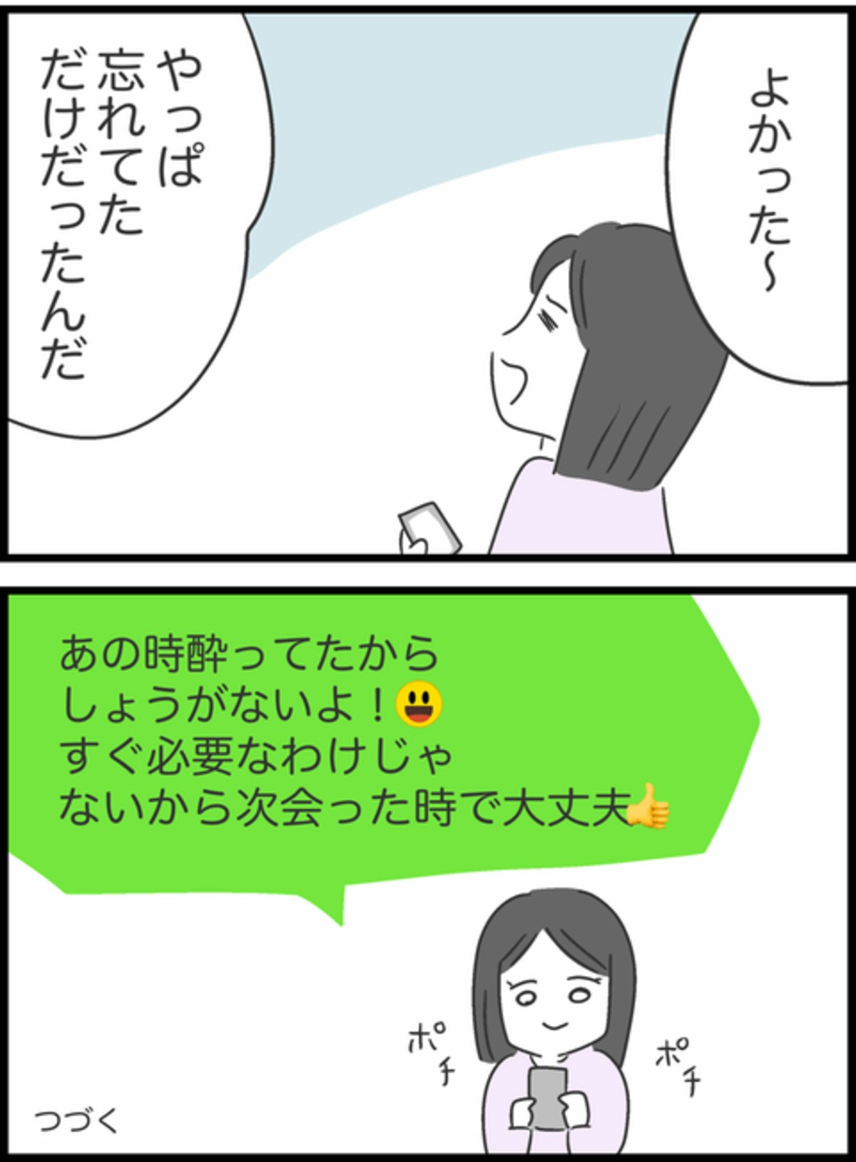 緊張しながら返信を見たすみれでしたが「忘れていた」という言葉に思わず安堵します。悪意があったわけではなく、りかの返す意思を確認できただけでもモヤモヤはすっかり晴れたようですね。次に会ったときには返してもらえるとわかり、すみれの表情もスッキリした様子です。