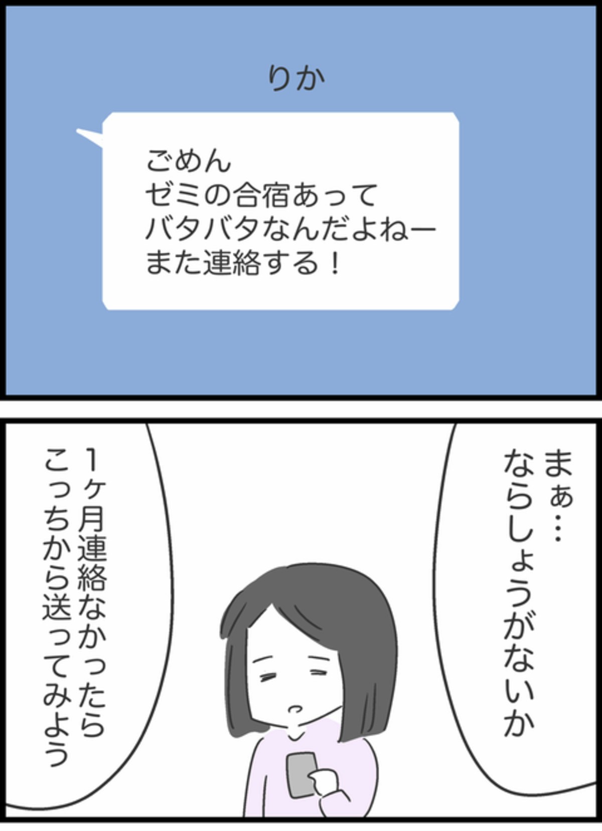 りかからは合宿があり近日中は難しいとの返事が。1ヶ月経っても連絡がなければまた言ってみようとすぐに会うことは諦めることにしたすみれ。深く考えずに貸したお金がここまで長引くとは思っていなかったでしょうし、そういう意図がなくても取り立てをしているように思えてしまったようですね。