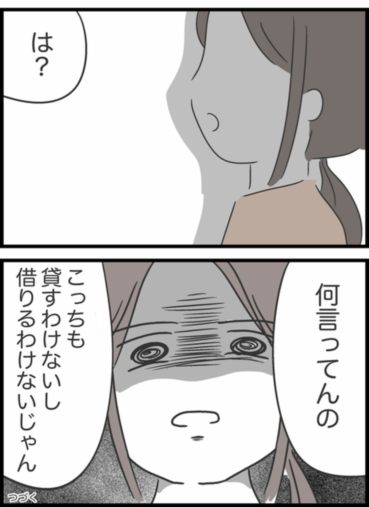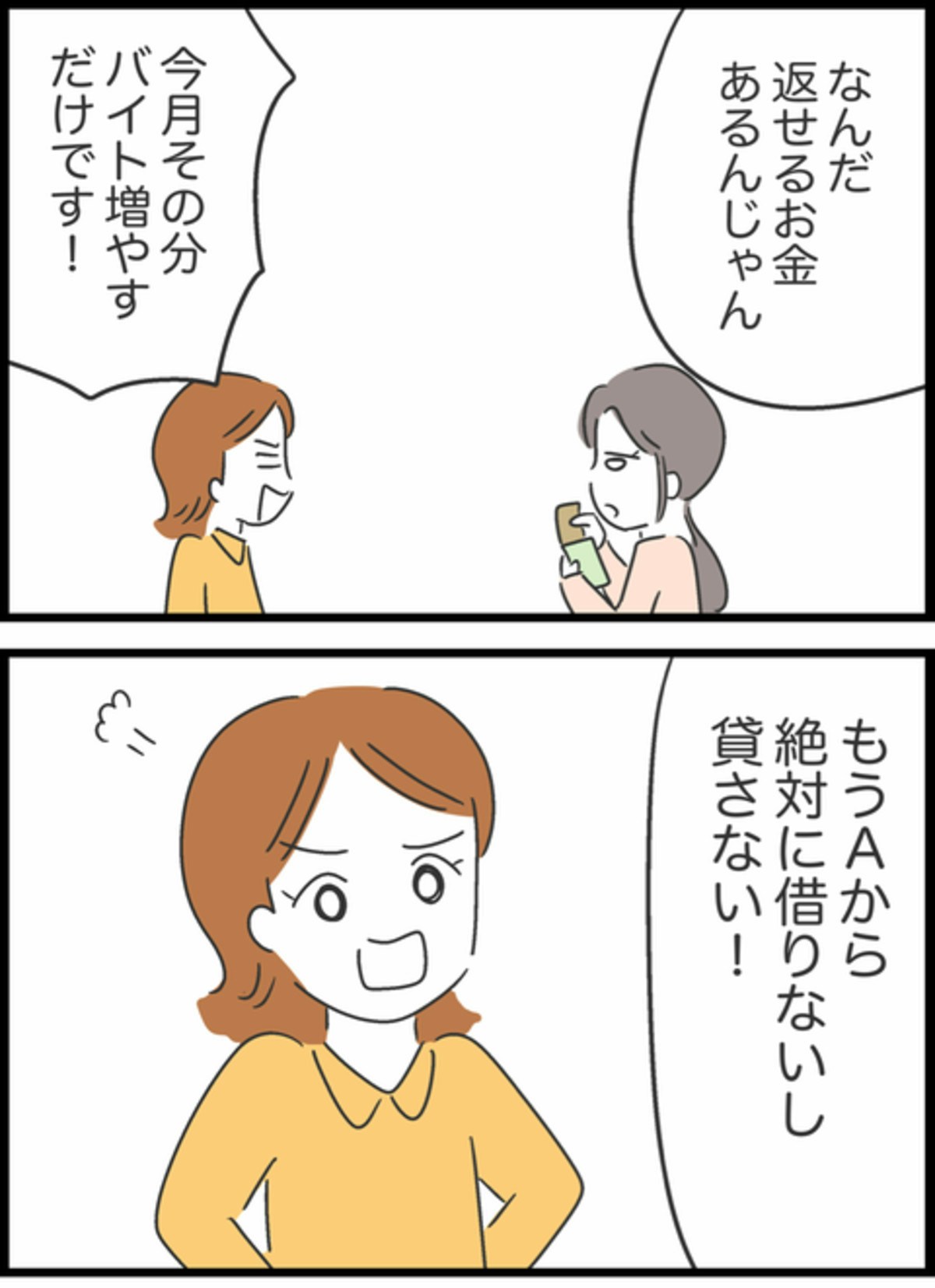 お金が足りないのだと思っていたのにお金があったことに拍子抜けしている様子のAちゃん。お金がないというのも嘘だったのではとつい考えてしまいますね…。お金を返すタイミングでも謝罪も感謝の言葉もないCちゃん。それどころか「もうAからは借りないし貸さない」と言い出します。その言葉にAちゃんも静かに怒りが込み上げているようです。
