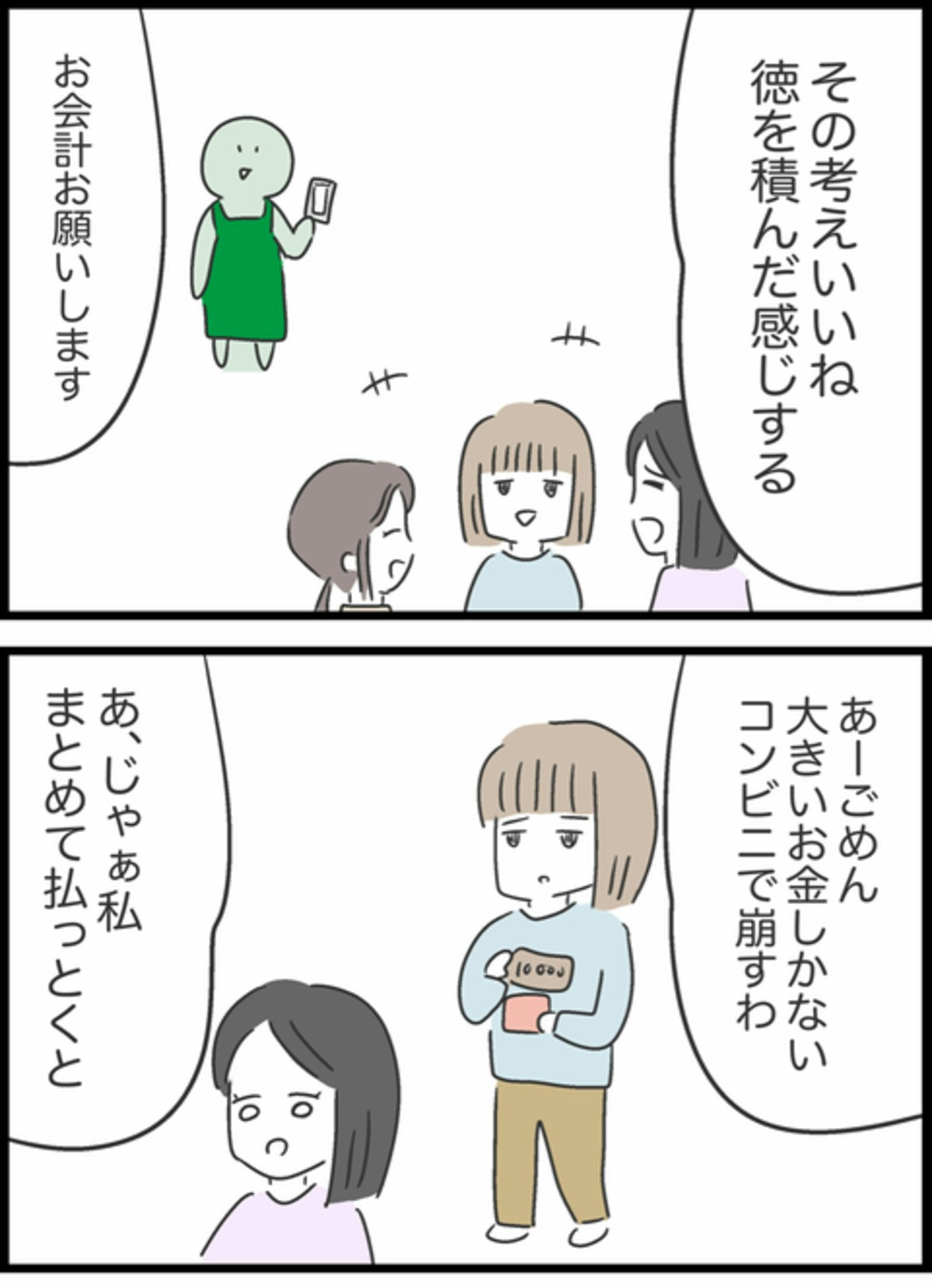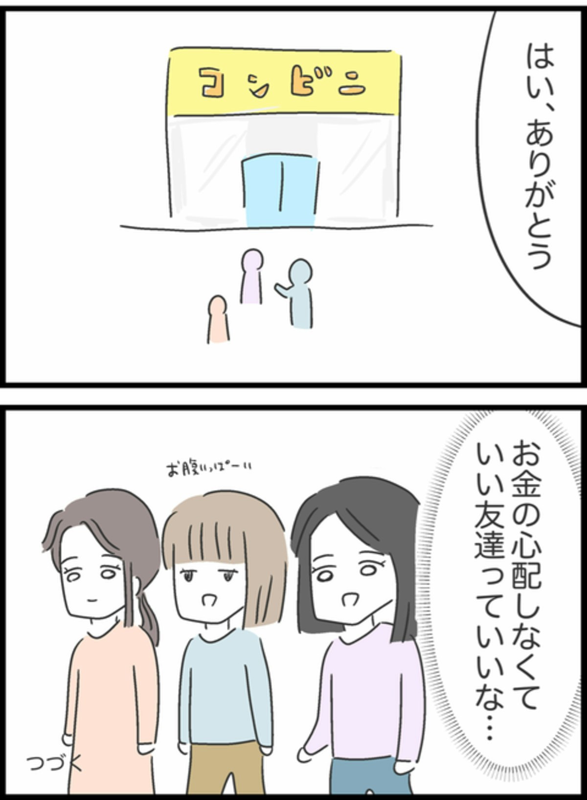 お会計になり、Bちゃんが「ごめん。大きいお金しかない。」と言いますが、すみれは快く立て替えてあげます。お店を出るとすぐにコンビニへ入り、お金をくずして返してくれました。「ありがとう」と言ってすぐにお金を返したくれたBちゃんに安心感を覚えたすみれ。そして、お金の心配をしなくていい友達といることの心地よさを実感するのでした。