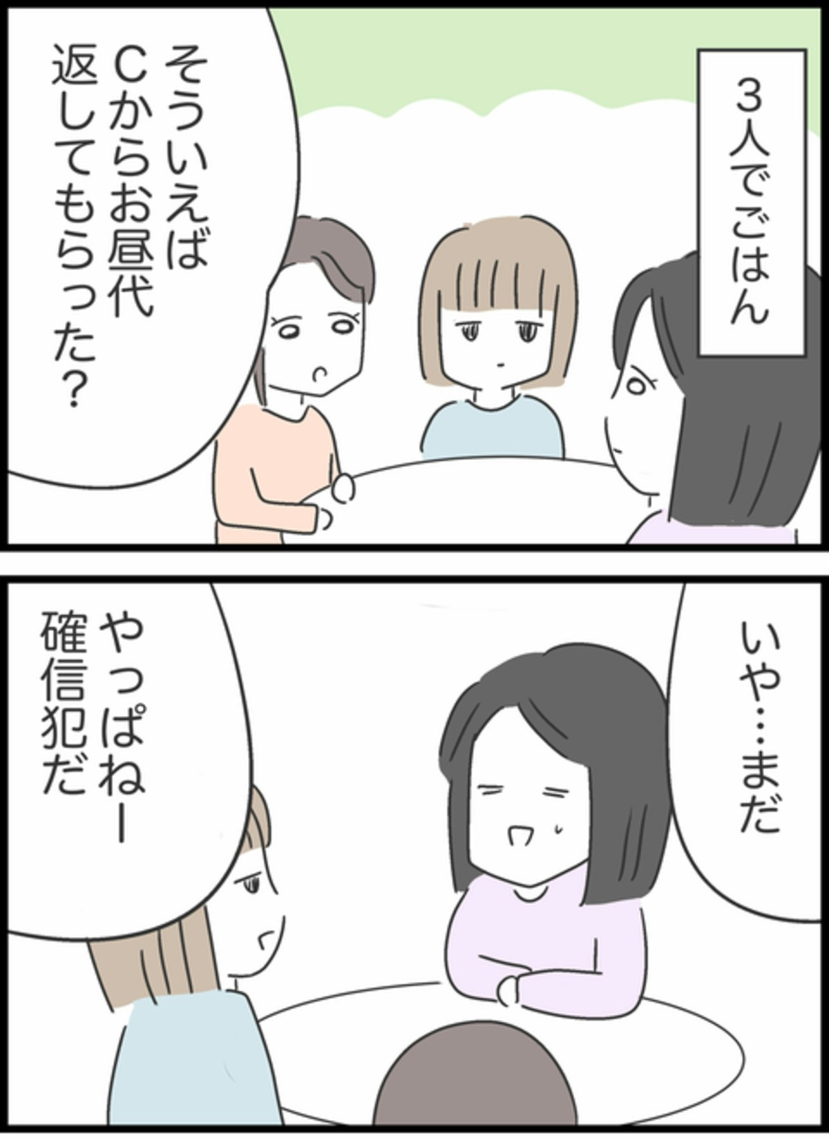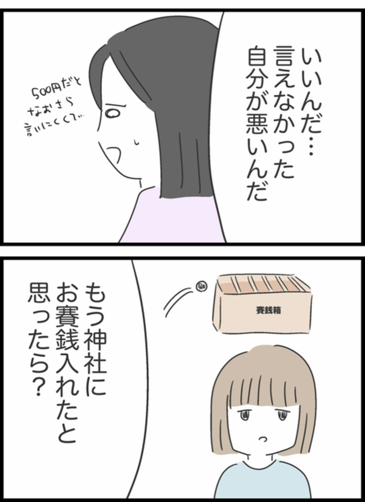 先日すみれがCちゃんに貸した500円の話題になり、まだ返してもらっていないと話すと「確信犯だね」という話に。すみれは自分が悪かったと反省しますが、Bちゃんから「お賽銭を入れたと思ったら?」と言われます。500円のためにCちゃんに催促をするのは気まずいでしょうし、関係が悪くなるのは正直面倒くさいですよね。Bちゃんのアイデアは実は的を得ているのかもしれません。