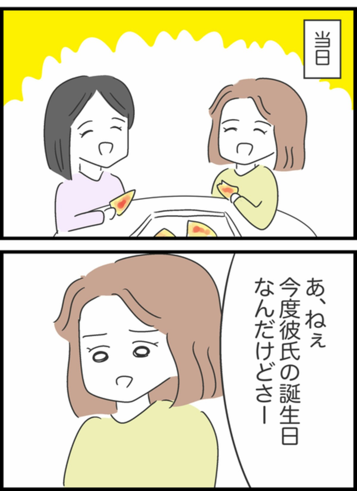 りかからの誘いにうれしそうなすみれ。お金の問題はもう解決し、これで以前のように楽しい時間を過ごせると思うと気持ちが全然違いますよね。当日はすみれの家でピザを食べ、楽しい時間を過ごしているように見えます。そんななか、りかが口を開きます。