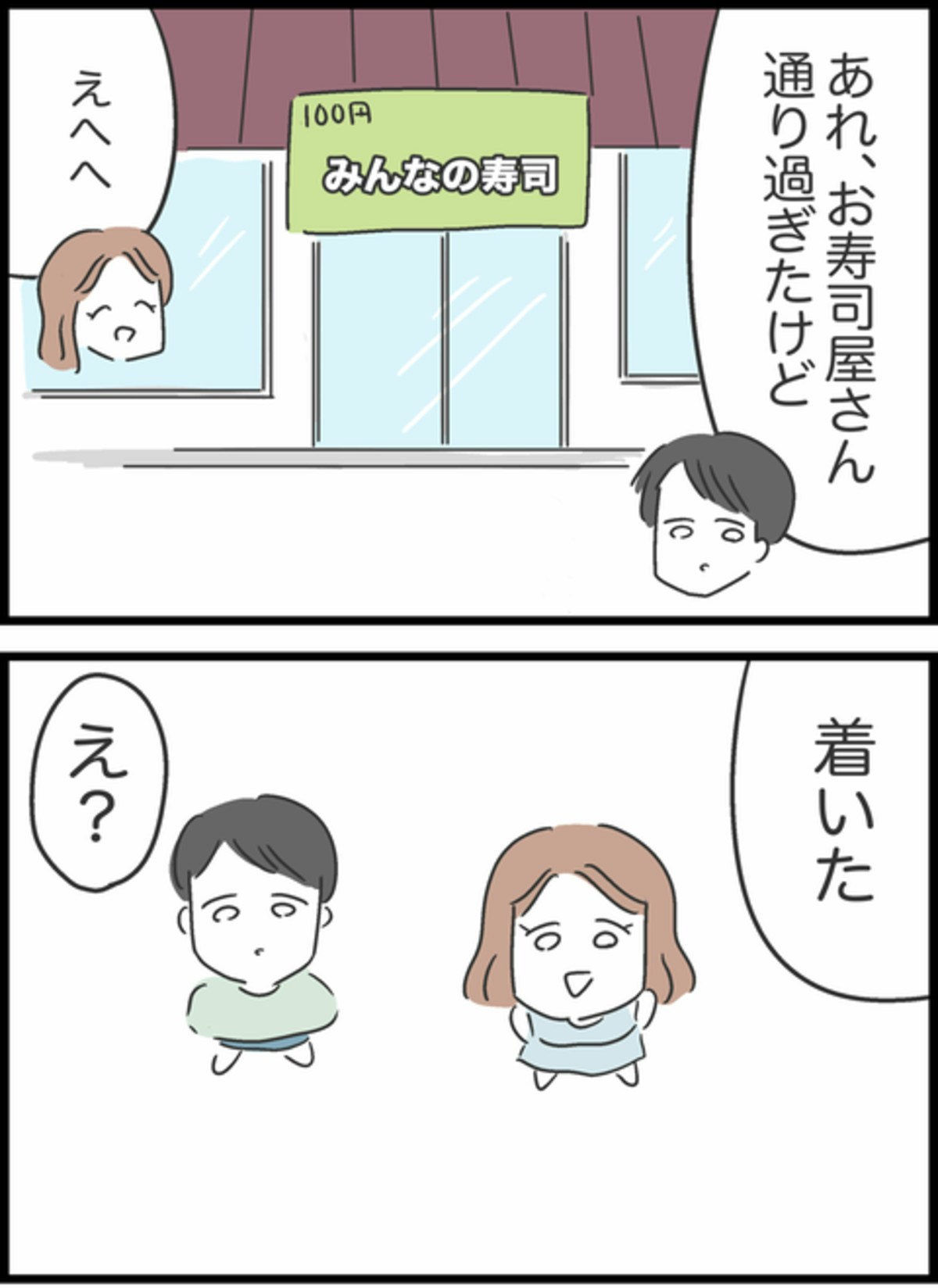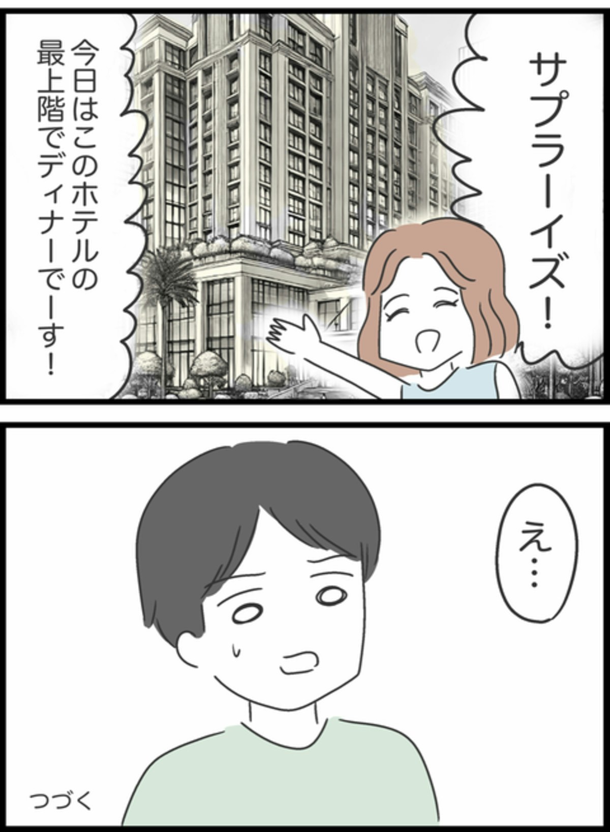 回転寿司が目の前にあるのに通り過ぎてしまうことに戸惑う彼氏。りかはホテルの前についてようやくこれがサプライズだと伝えます。回転寿司だと思っていたのにホテルのディナーだと言われて彼氏は焦っているようにも見えますね。りかはサプライズが成功してうれしそうですが、これは急に言われても困ってしまうタイプのサプライズですよね。