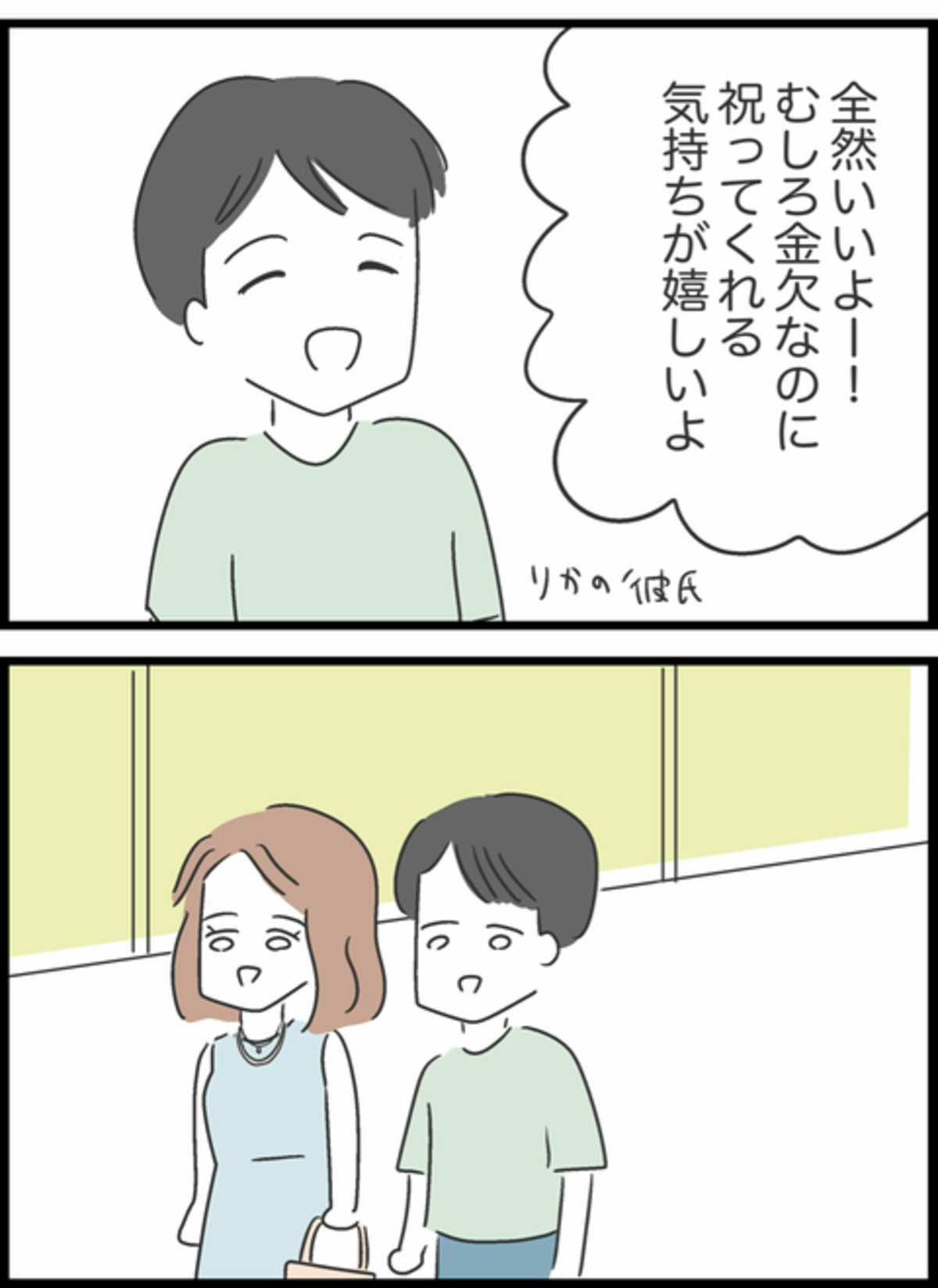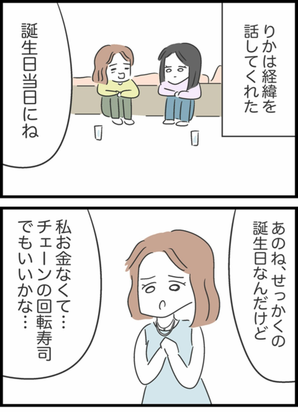 彼氏の誕生日に金欠だからチェーンの回転寿司でお祝いしようと話をしたりか。彼氏はお祝いしれくれるだけでうれしいとお店のことはまったく気にしていない様子です。