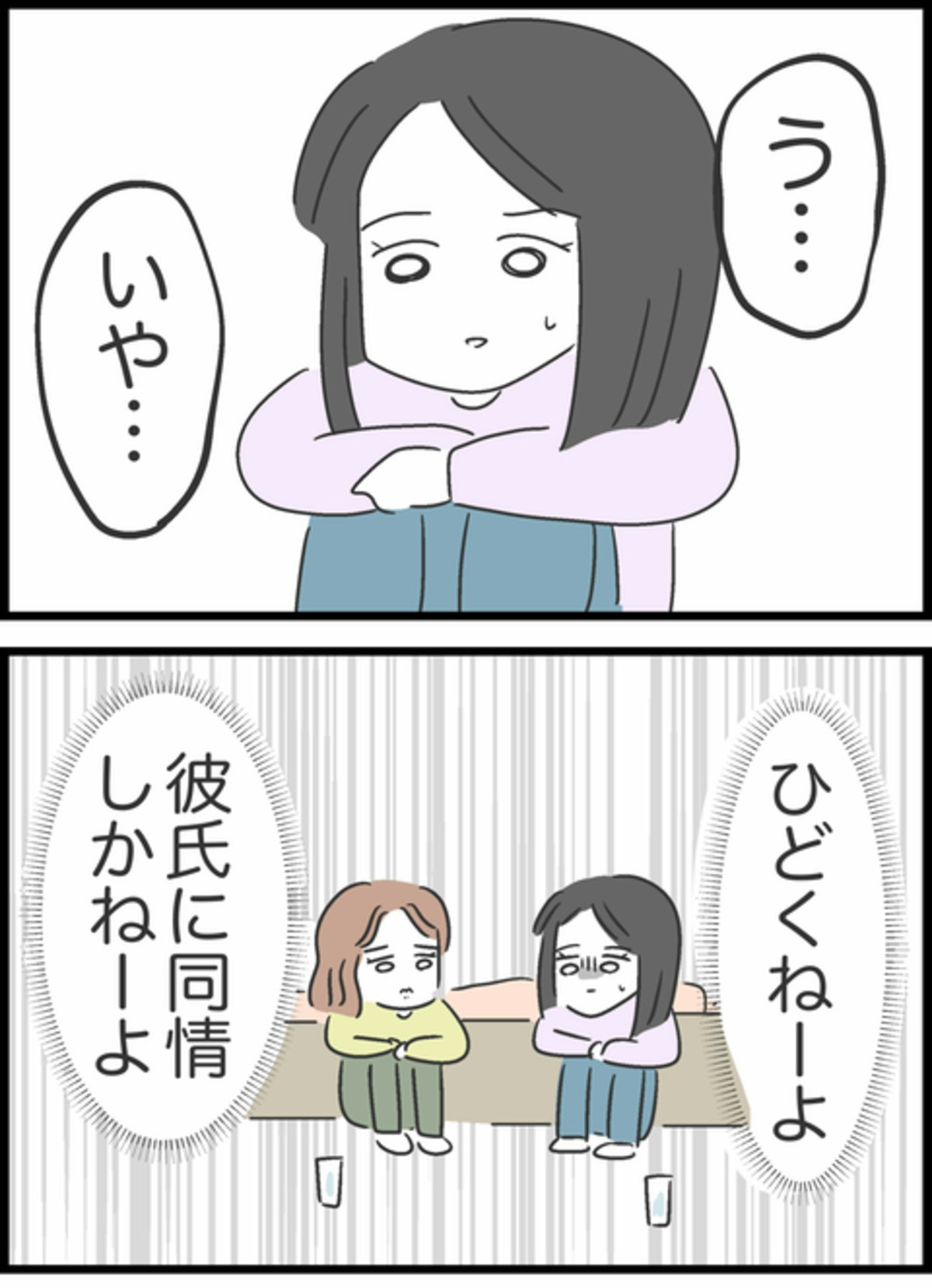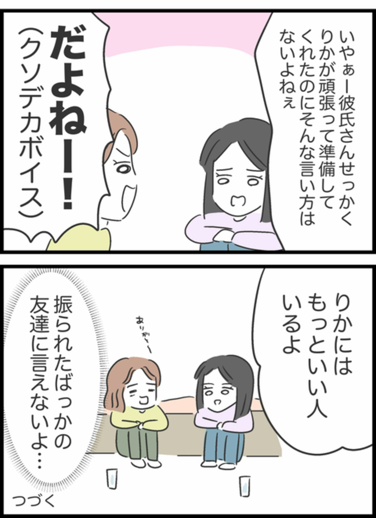 りかの話を聞き、あまりのひどさに彼氏に同情することしかできなかったすみれ。しかし、はっきりとりかに伝えるべきか黙っておくべきか悩みます。泣きそうになっているりかを前に追い討ちをかけるようなことは言えなかったすみれはなぐさめの言葉をかけることに。
