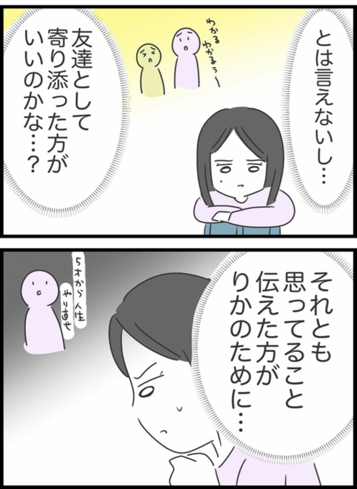 りかの話を静かに聞いていたすみれ。彼氏の言っていることはすべて正論で思わず彼氏に同情してしまいます。しかし、りかにそんなことを言うわけにもいかず、友達としてどうりかに声をかければいいのかを必死で考えることに。フラれて傷ついているときですし、変なことを言って地雷を踏みたくもないですよね。