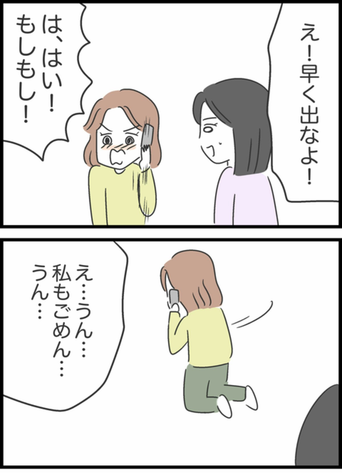 別れた彼氏からの電話に思わず「早く出なよ!」と言ったすみれ。しかし、話をするりかの様子から2人が復縁したと察します。まさかの流れに一気に冷めてしまったすみれでしたが、りかは「長くなりそうだから漫画でも読んで待ってて」と言い部屋を出て行ってしまいます。