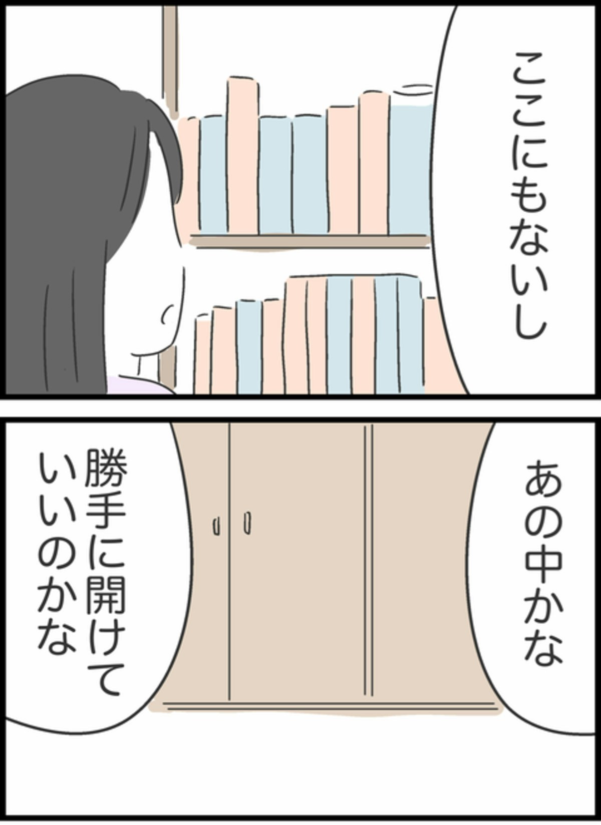 部屋のなかを見たものの、漫画を見つけられずにいたすみれ。勝手に開けていいものか迷いながらも漫画が入っていそうなクローゼットを開けてみることに。そこですみれは何かを見つけたようです。漫画を見つけられたのでしょうか。