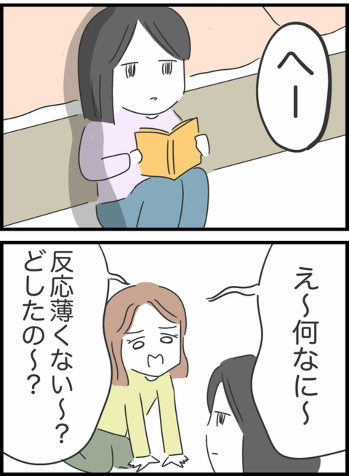 りかの部屋で漫画を探していたすみれは本棚がなくなかなか見つけられずにいました。開けていいのか迷いながらも漫画がありそうなクローゼットを開けてみることに。1時間後、りかは電話を終えて部屋に戻ってきましたがそのテンションは高く、復縁の話をしたくて仕方がない様子。しかし、すみれは「へー」と言うだけでテンションも低く、さっきまでのすみれとは別人かのようになっていました。