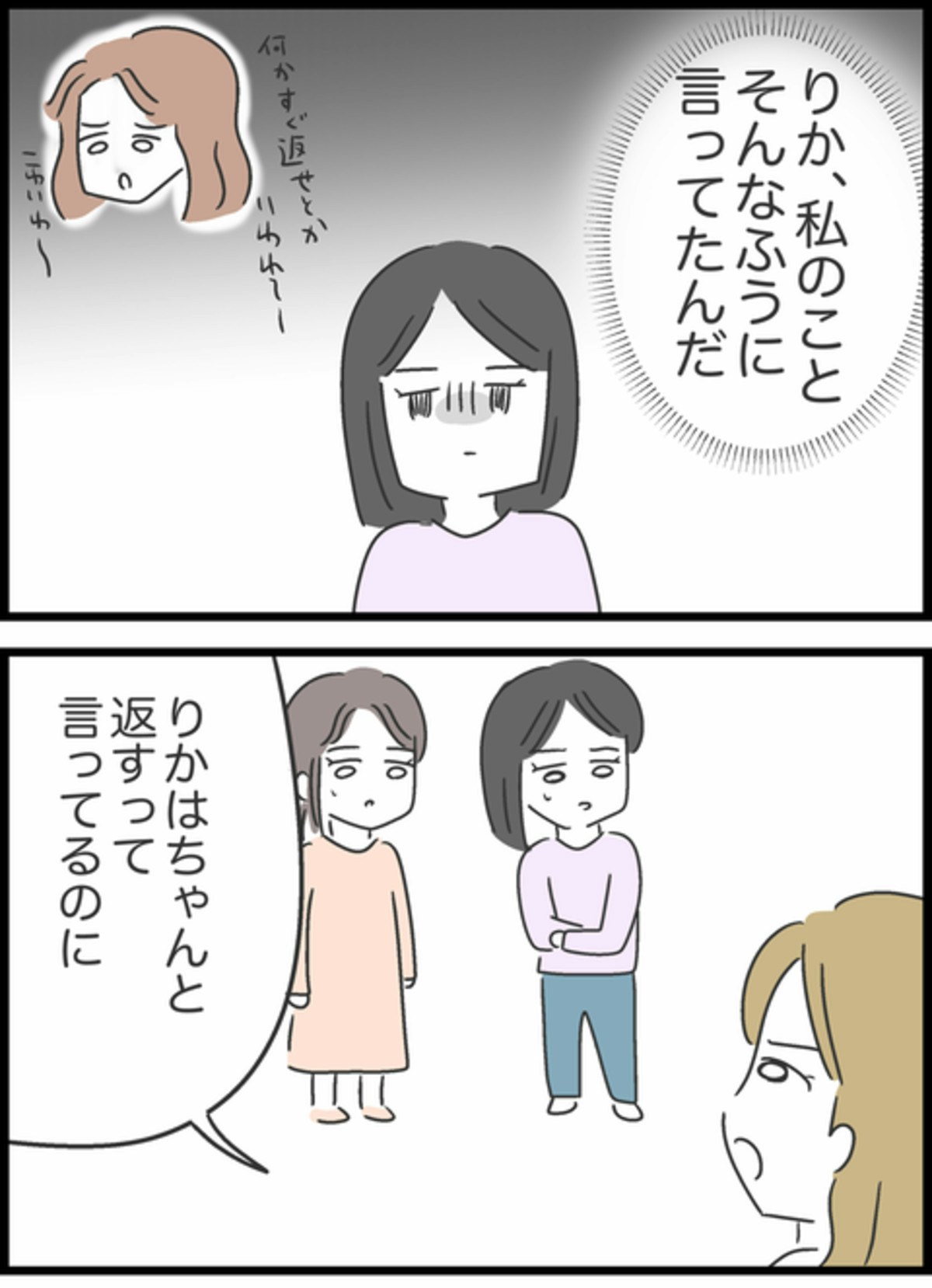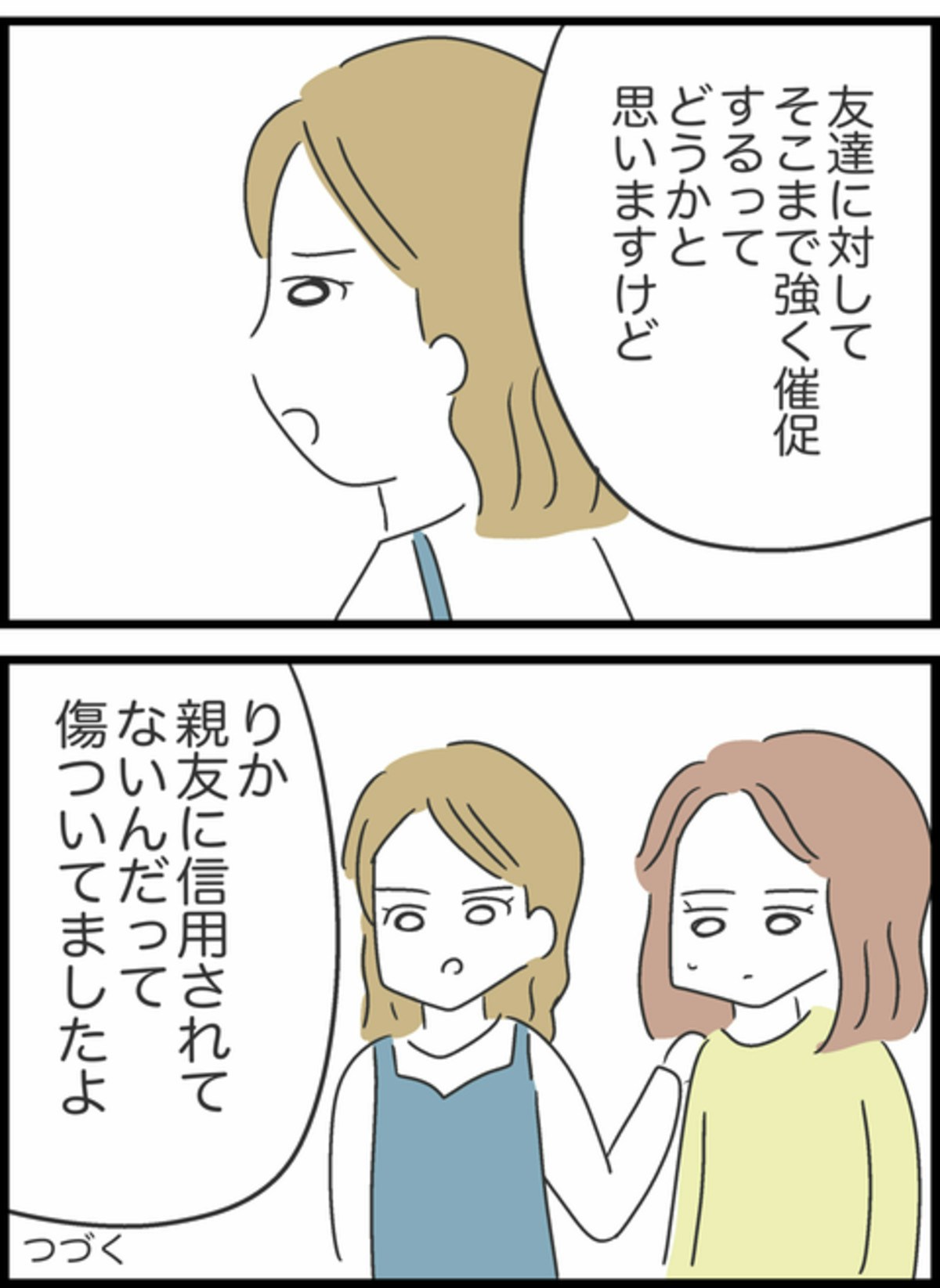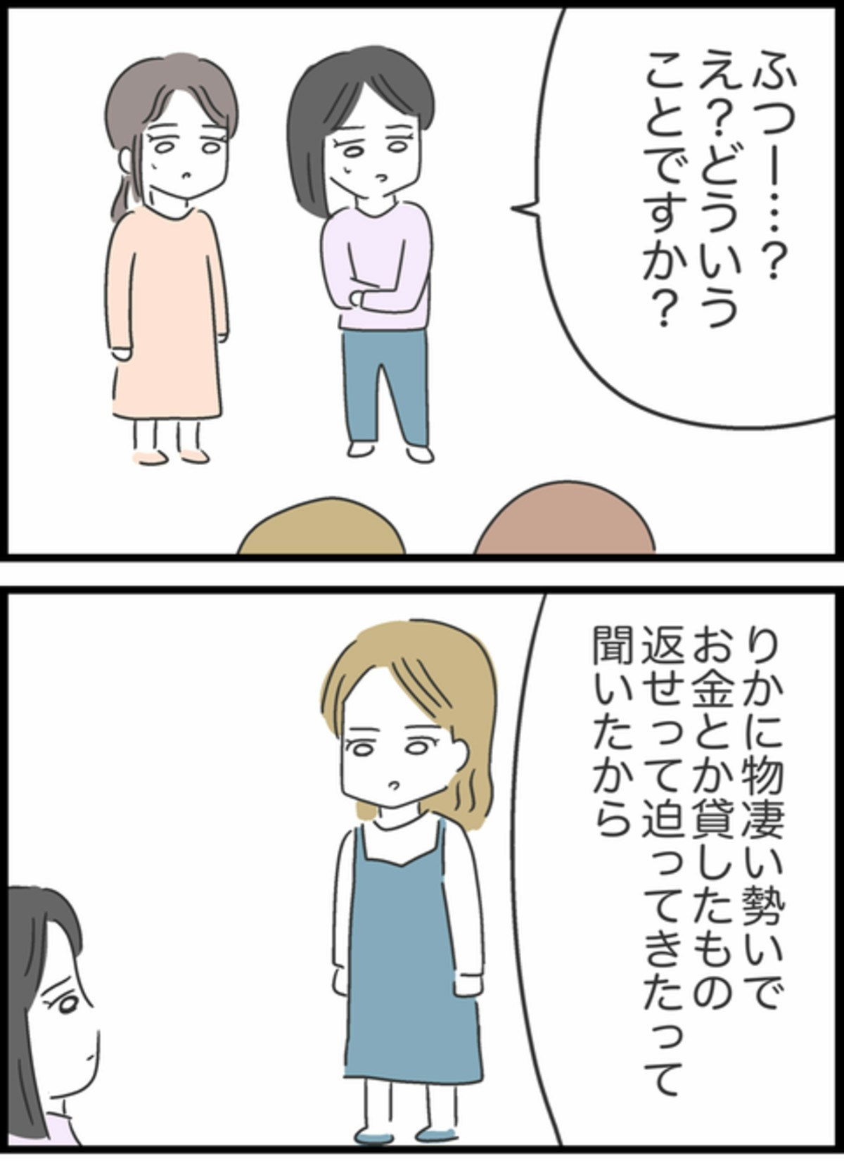 りかがそんな風に言っていたことを知りショックを受けたすみれ。友達はさらに「そこまで催促するのはどうかと思う。りかが傷ついていた」と続けます。友達は本当のことを知らないまま、りかに言われたことを信じているのかもしれませんが、そもそも信用を失うようなことをしていたのはりかですよね。りかはどんな気持ちで聞いているのでしょう…。