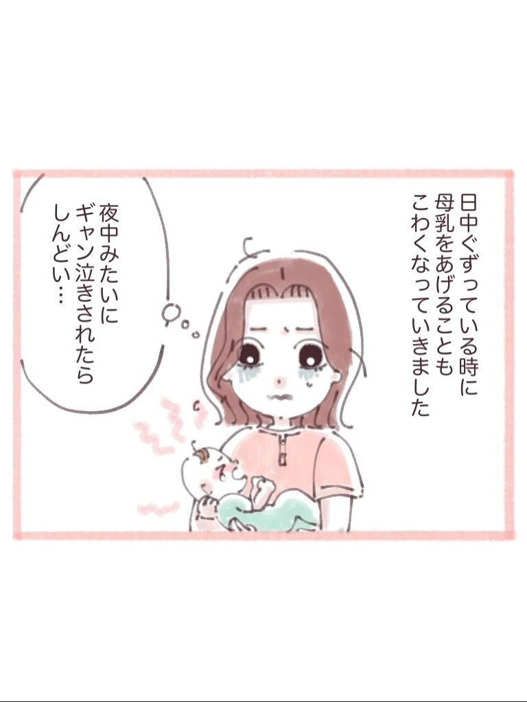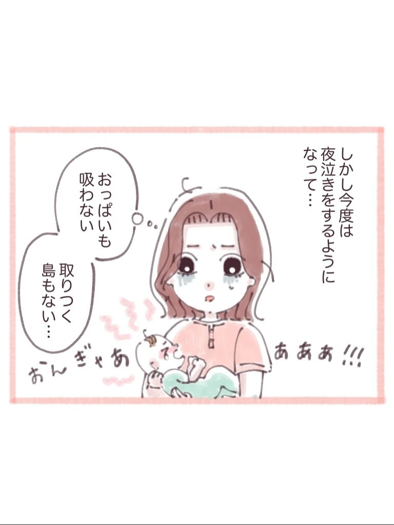 順調だったはずの授乳に、またもや暗雲がたちこめます。夜泣きが始まり、ママは心身ともに辟易。夜泣き中は母乳も吸ってくれずに大泣きするので、日中母乳をあげるときも「また泣かれたらこわい」と、追い詰められていきました。