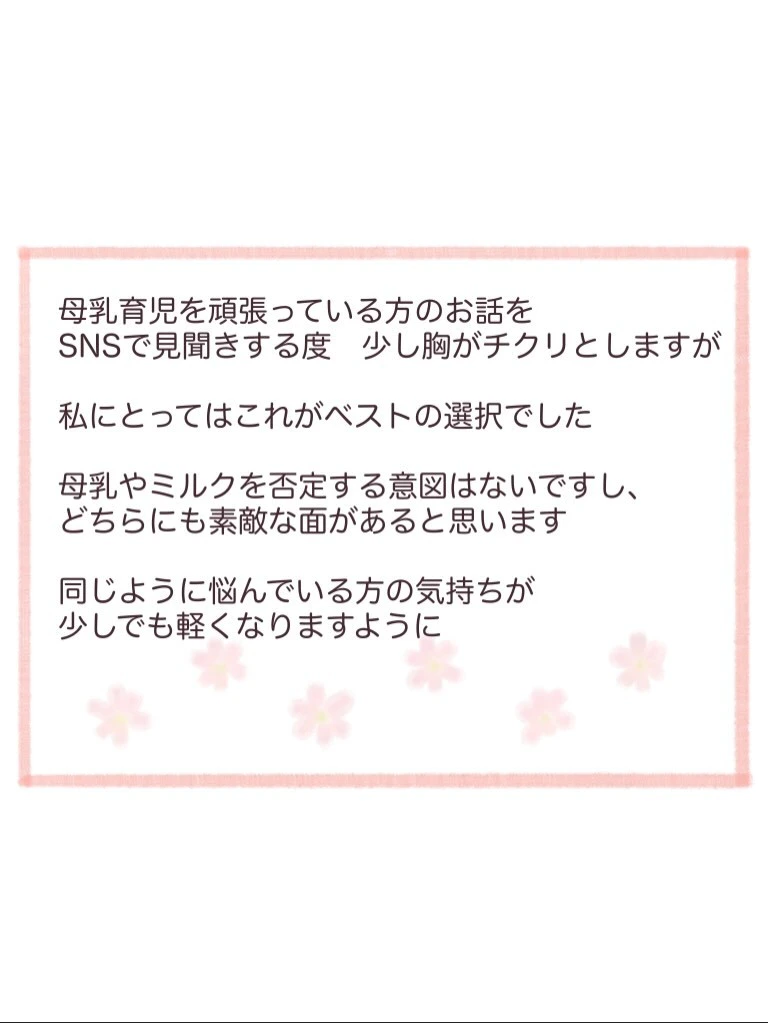 母乳拒否に悩み、完全ミルクに切り替える決意をしたママ。母子ともに、穏やかな気持ちでいられるようになりました。わが家はこのスタイルが良かったんだと思いつつ、母乳育児をしている人を見ると、胸がチクリとすることもあります。