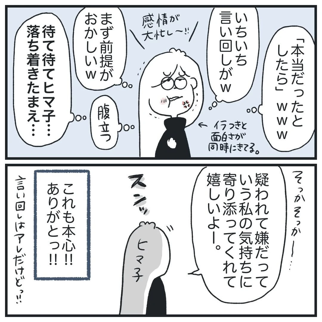 彼氏が「ヤバイ」と言っていたのは、「ヒマ子さんを疑ってしまうのを止められないこと」のようです。彼氏は彼氏で、苦悩していたのですね。
