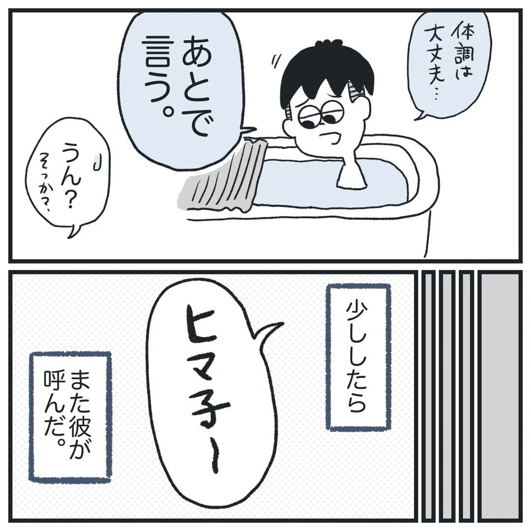朝風呂中の彼氏は、ヒマ子さんを呼んで「なんかもうヤバイ」と一言。体調は大丈夫そうですが、一体何があったのでしょうか。
