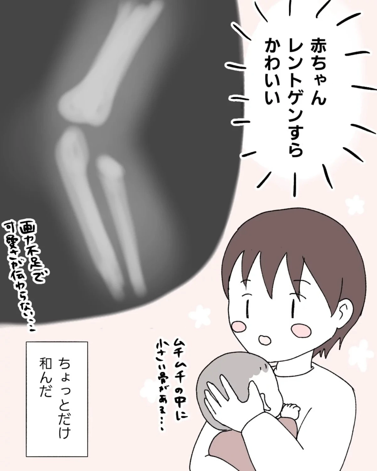 不安だったなっぽさんでしたが、赤ちゃんのレントゲン写真はかわいいという発見もあり、少しだけ和みました。さらに自分の調べたとおり「肘内障」だったことや、外れた関節を戻してもらい安心します。