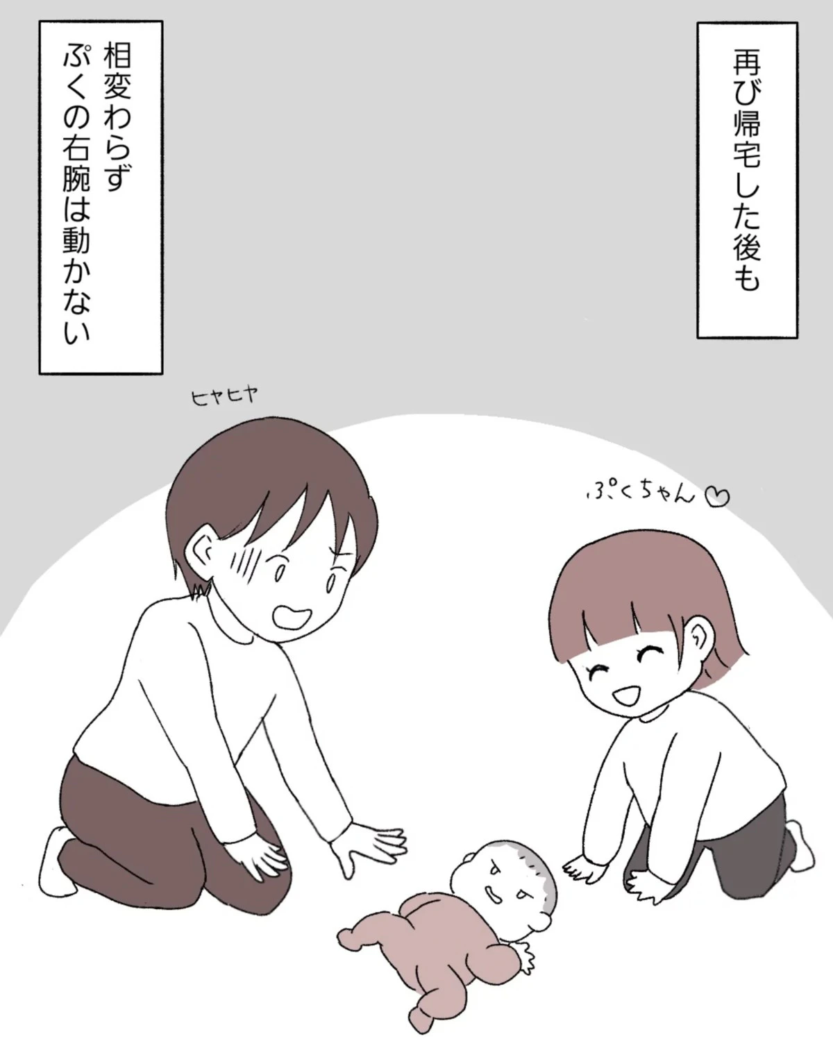 なっぽさんは、ぷくちゃんの動かない腕が気になって服を脱がせるのも慎重になります。そして、いつもより夜泣きの回数が多く、普段と違うことばかりでした。