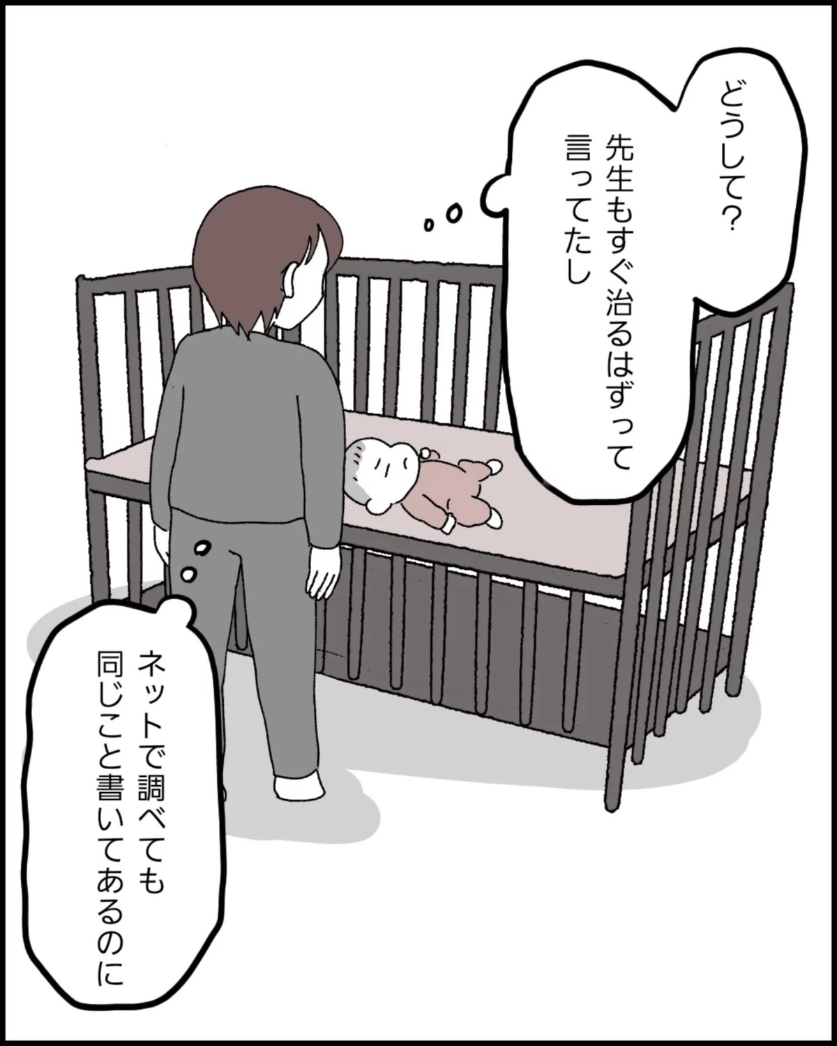 今も娘の腕は動かないのに、医師から3日間もようすを見てと言われて驚きを隠せないなっぽさん。医師の言うとおりにすれば、本当にぷくちゃんは良くなるのでしょうか。
