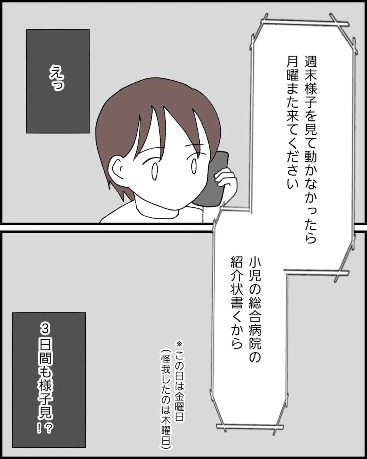整形外科の医師からは、さらにようすを見るように言われます。ようすを見たうえで、変化がないなら3日後に来院してほしいとのことでした。