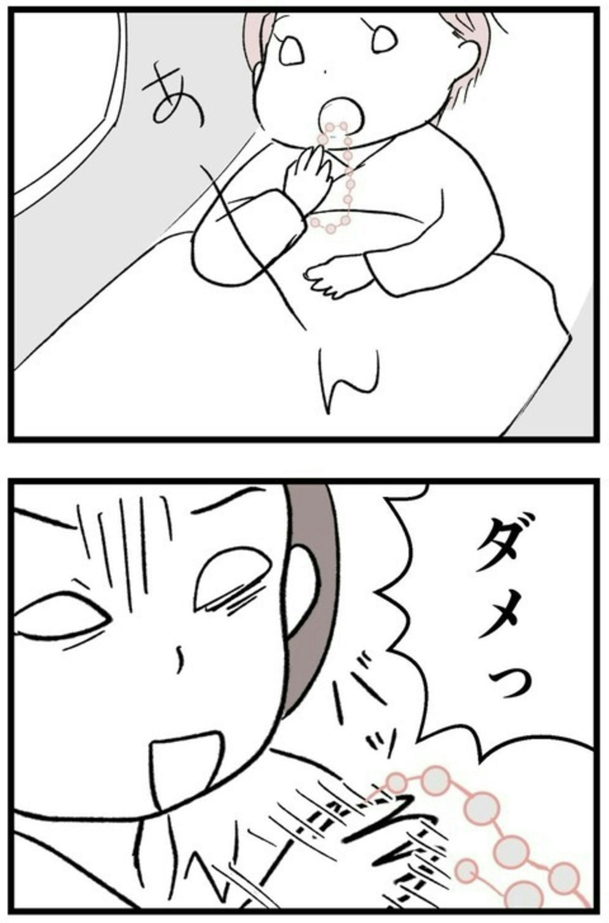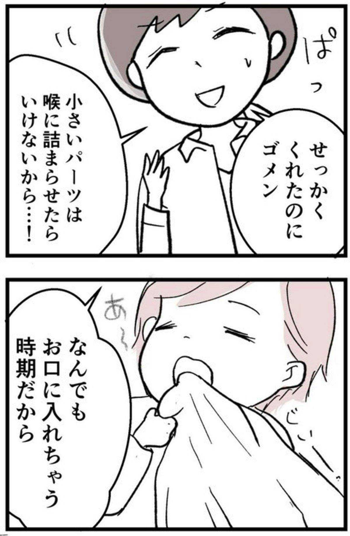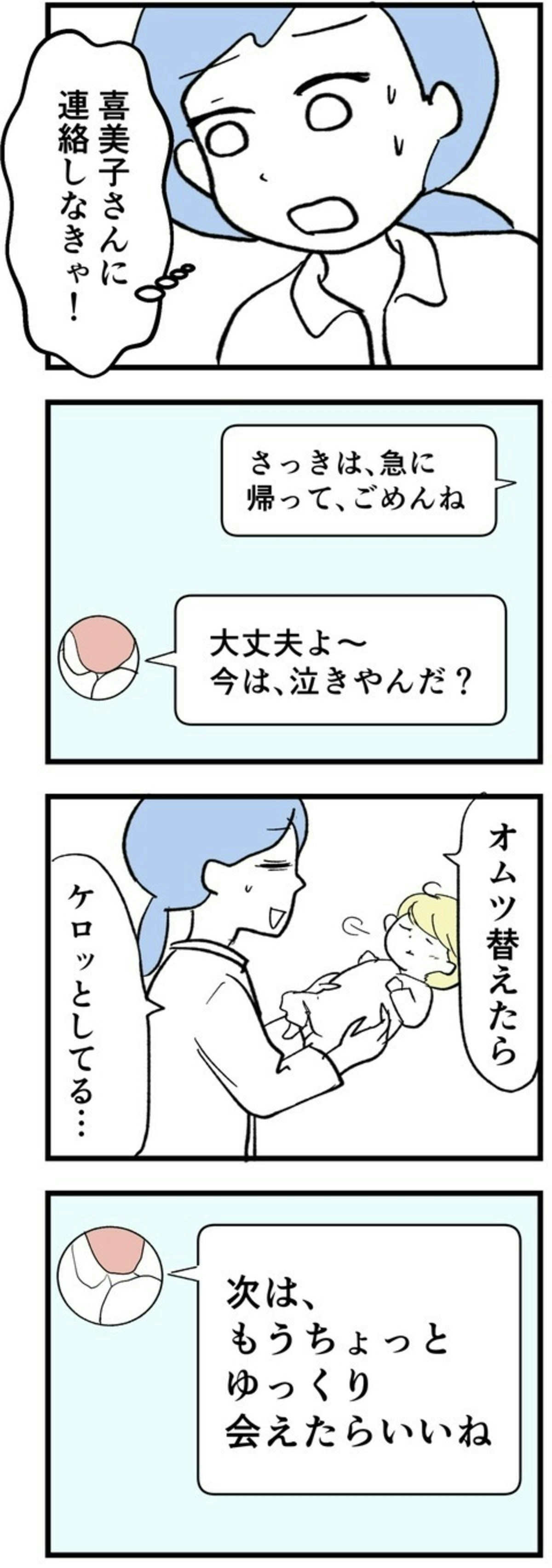 里帰り出産から帰ってきた まゆは、久しぶりに年上の友人・貴美子と再会。ところが、貴美子は赤ちゃんに予想外のプレゼントを手渡したのです…。誤飲の可能性があるものは、ドキッとしますね。