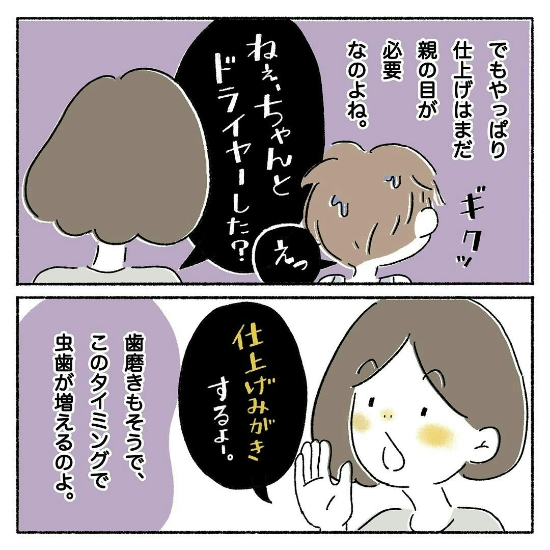 また、今回のできごとを教訓に「親の目が必要」ということに気づきました。それに、洗髪やドライヤー、歯の仕上げ磨きなどは、親子のコミュニケーションにもなりますね。子どものやる気を削がないようにしつつも、大切なわが子を守らなければいけませんね。