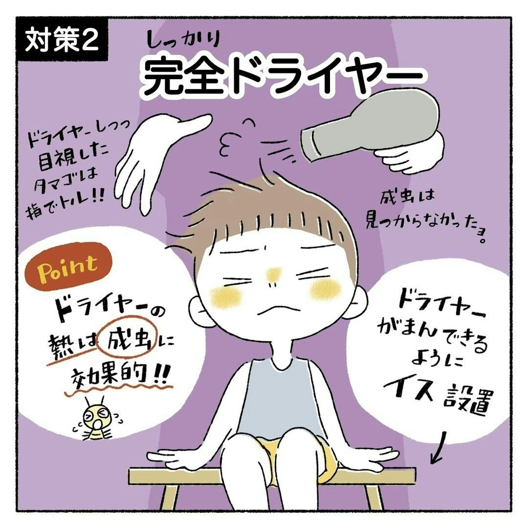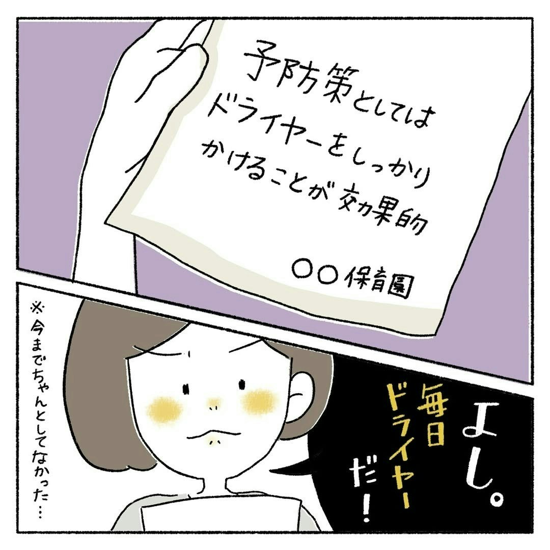 ある日、保育園からかかってきた電話にドキッとし、おそるおそる応答すると「頭シラミの卵が息子くんの頭にありました」という報告でした。思い返すと、ドライヤーをさぼってしまったことが、悔やまれます。