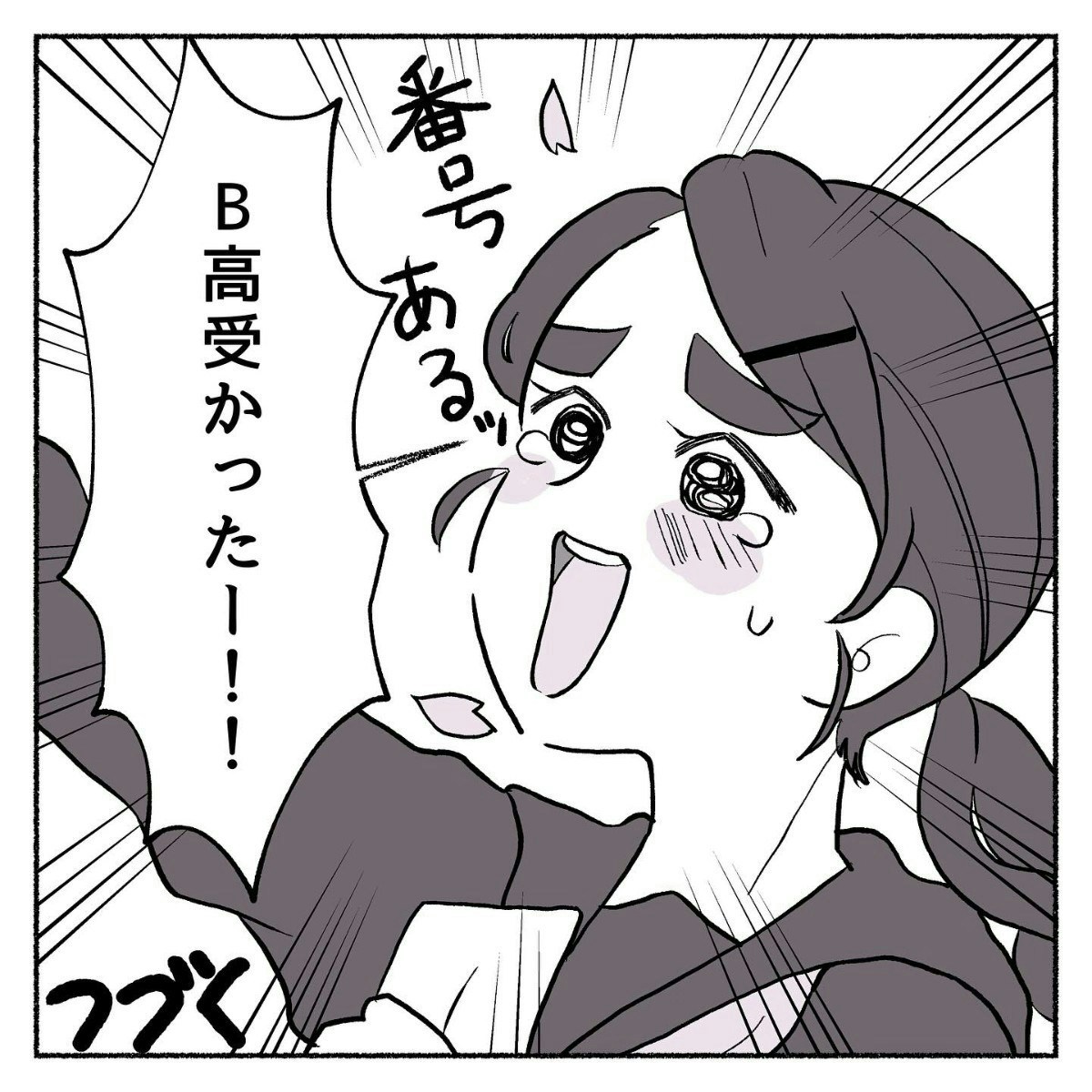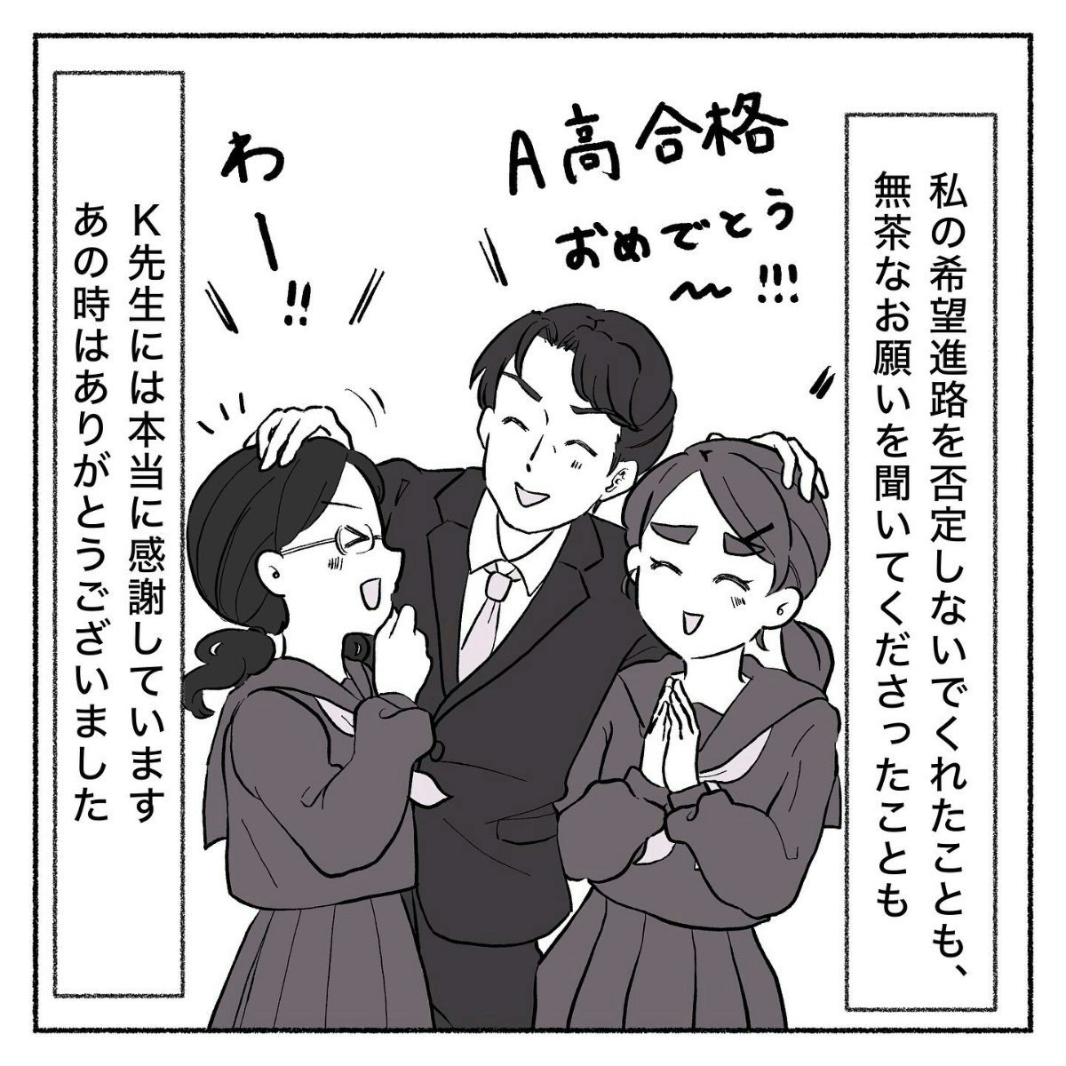 友だちとふたり、先生から「頭ポンポン」をしてもらい、合格をよろこび合いました。ハッピーな結末を迎え、本当によかったですね。