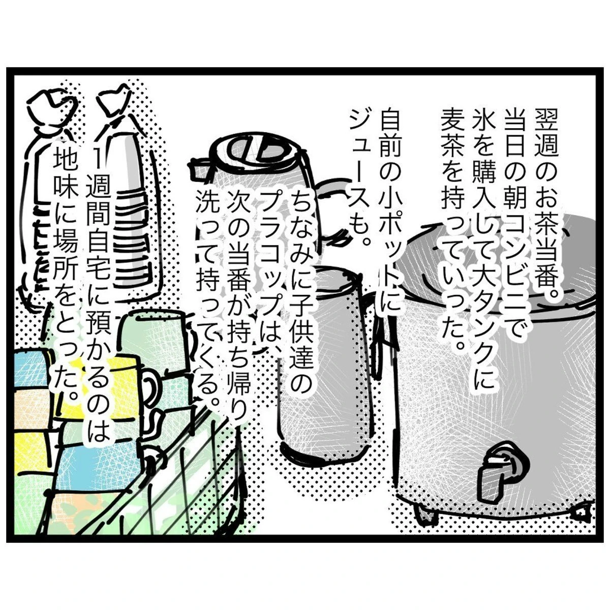 大タンクいっぱいにお茶を用意するのは、大変そうですね…。家庭用の氷では、足りそうもありません。当番制なので、毎回ではありませんが、それでもお茶と氷、さらにジュース代の出費は地味に痛いですね…。