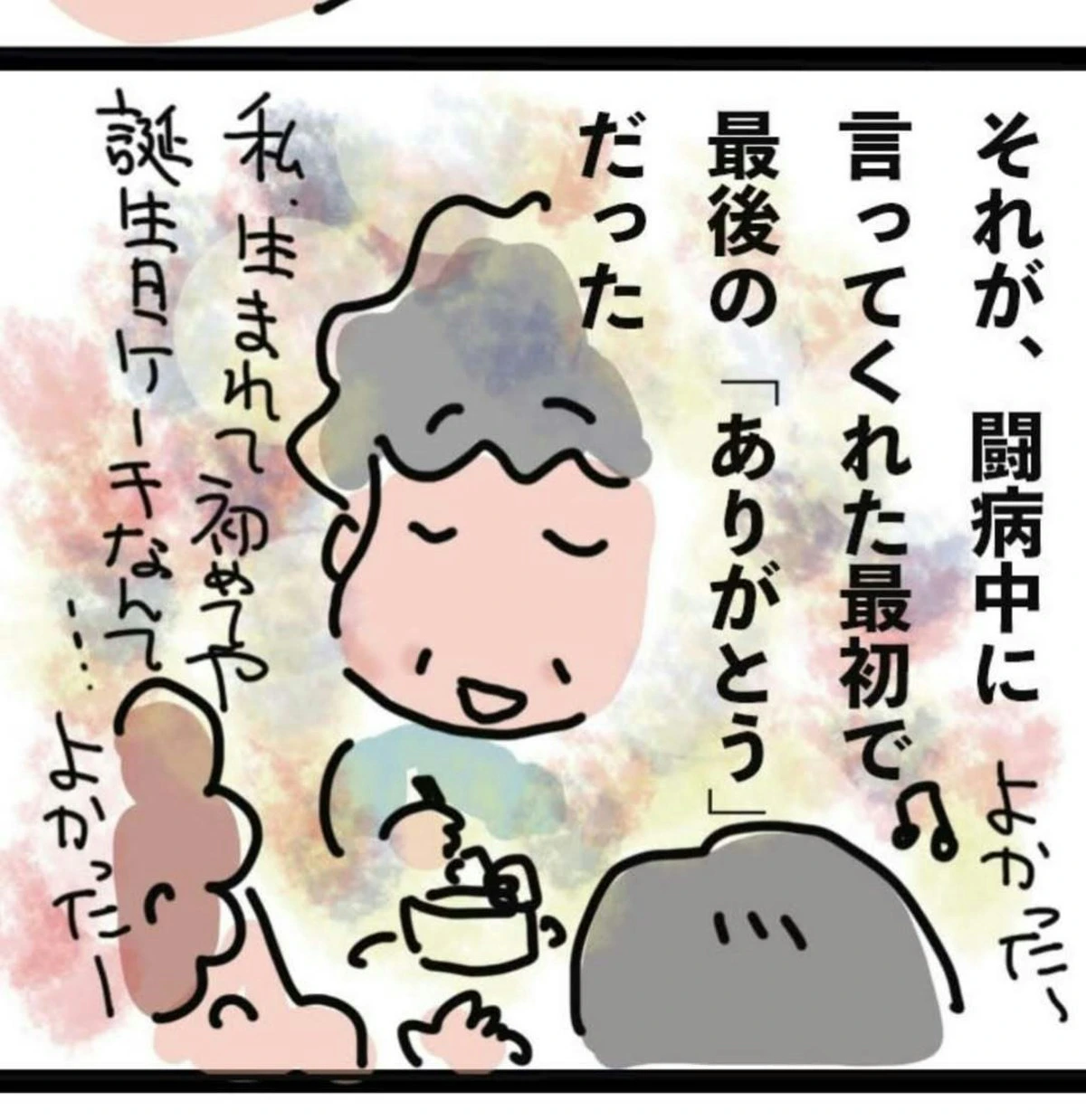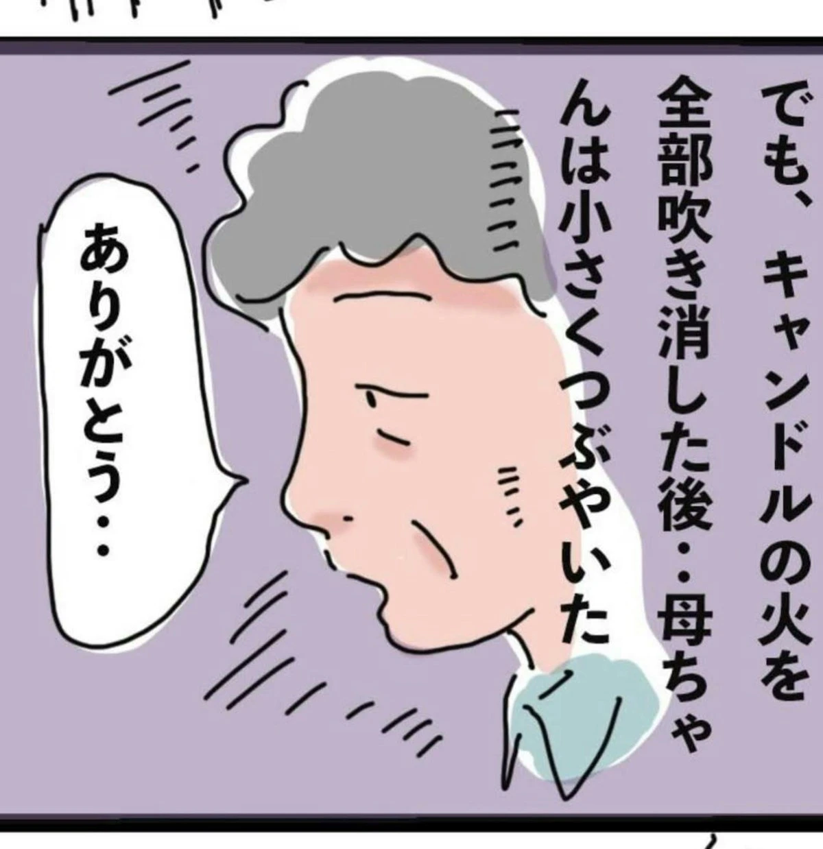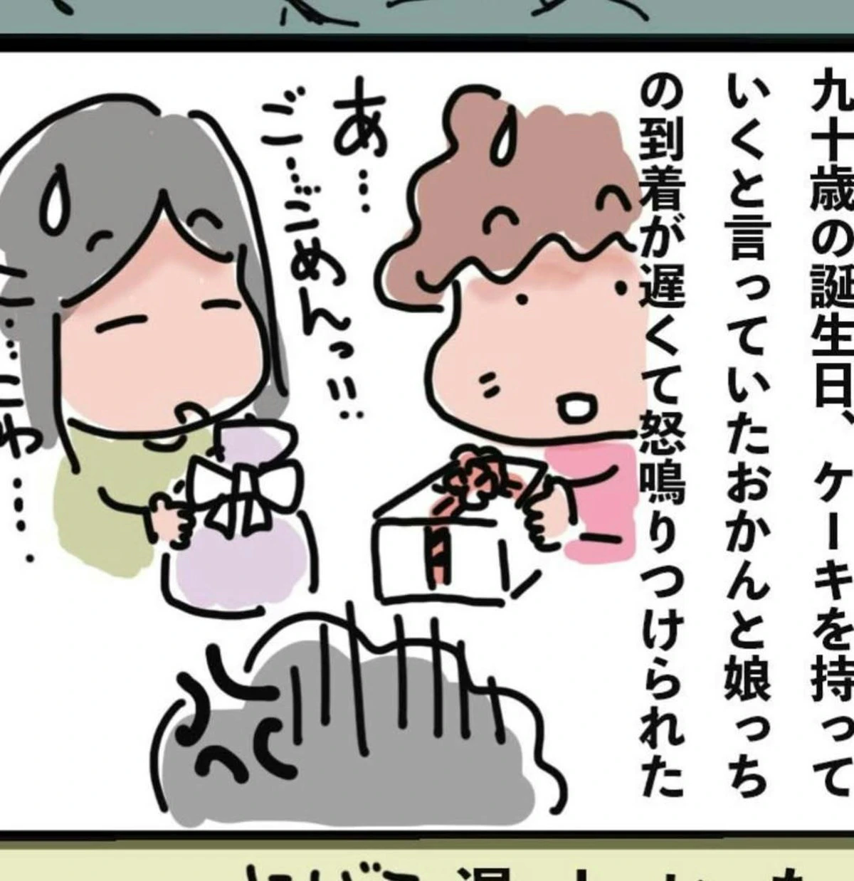 末期がんと宣告され、迎えた90歳の誕生日。ケーキとプレゼントを持って、お祝いに駆けつけますが「遅い」と睨まれてしまいました…。ですが一方で、感謝の気持ちもあるようで、初めて「ありがとう」と言われます。