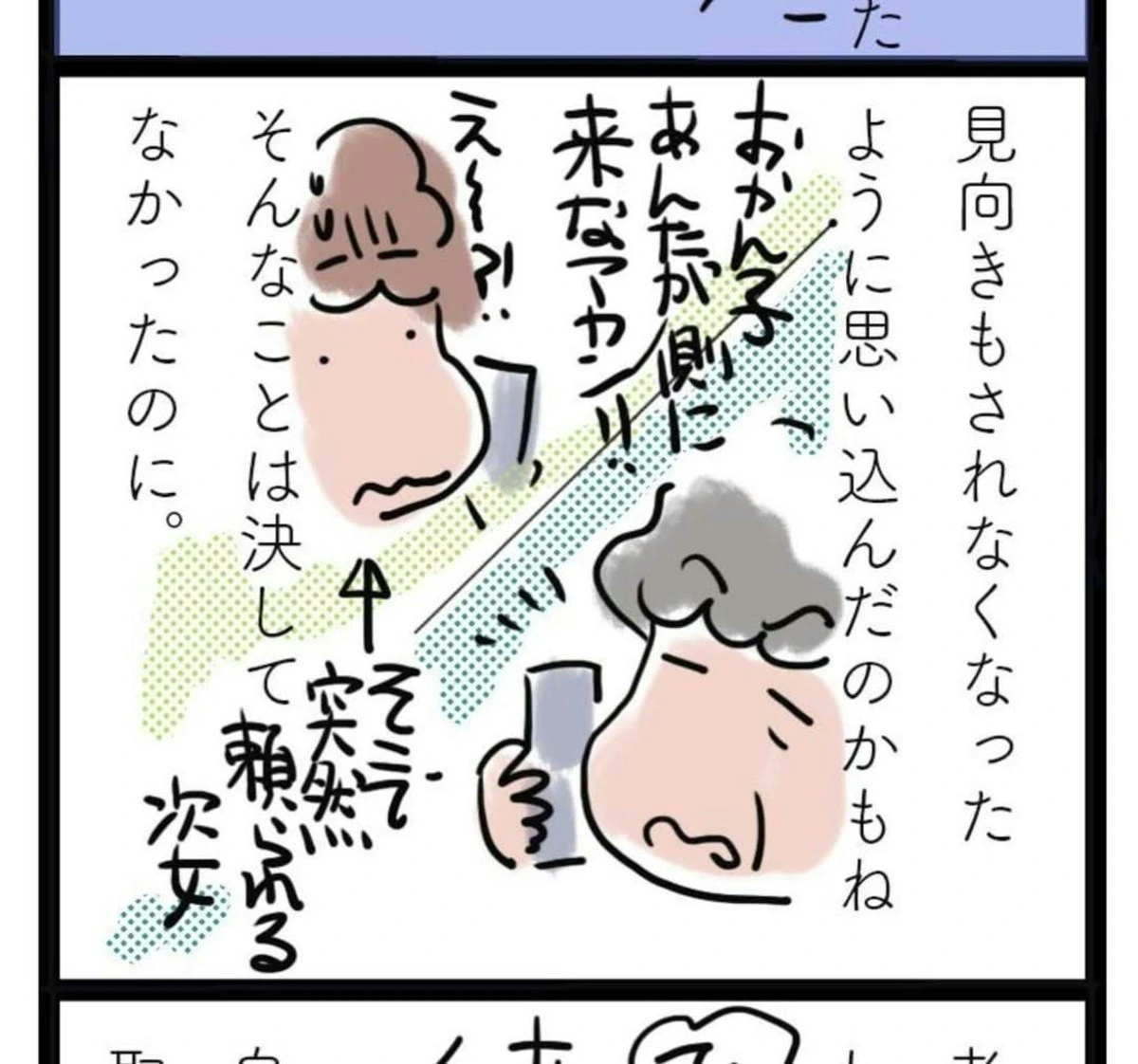 おかん子さんの母は、家族に囲まれ幸せそうな人生を歩んでいました。ですが、年齢を重ねるごとに思い込みと孤独感が増し、卑屈になっていたようです。母の心境を想像しながらも、おかん子さんは共感することはできませんでした。