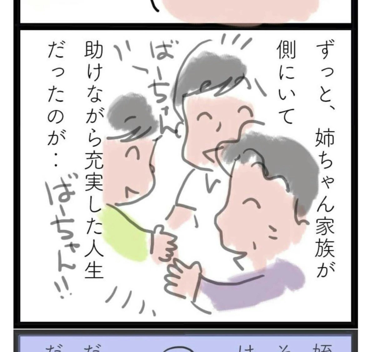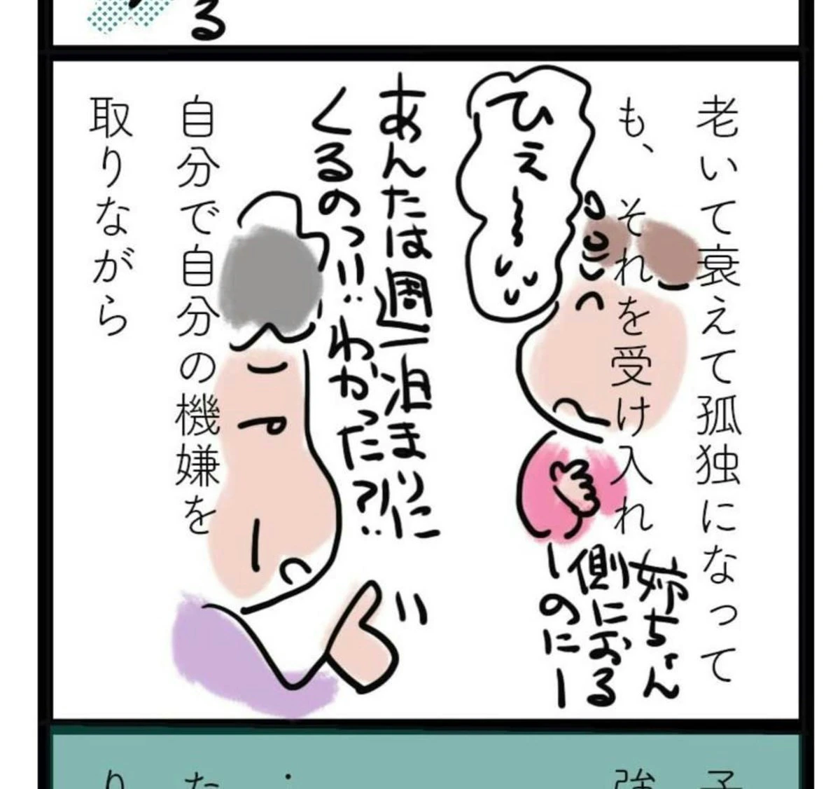 その後、母は逝去。四十九日の法要の日、おかん子さんは初めて母の孤独に気づきます。ずっと、母と同居していた姉家族。和気あいあいとした様子を見て、おかん子さんは…。