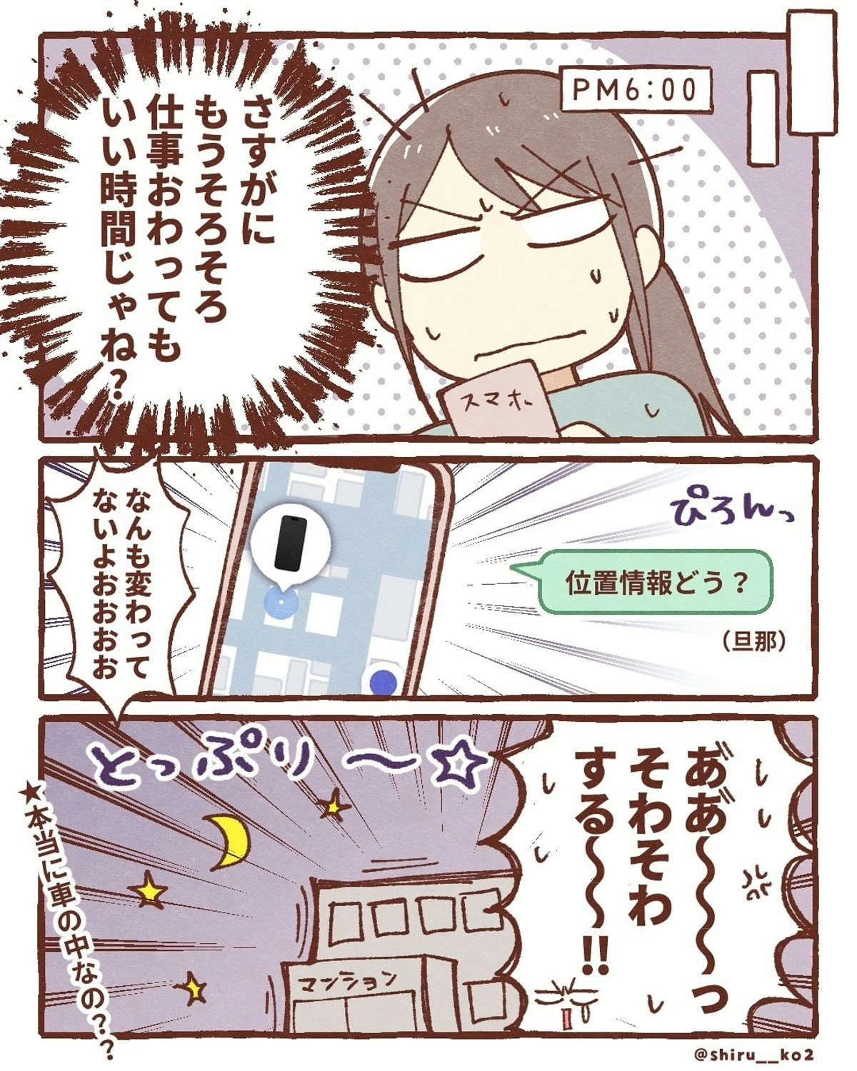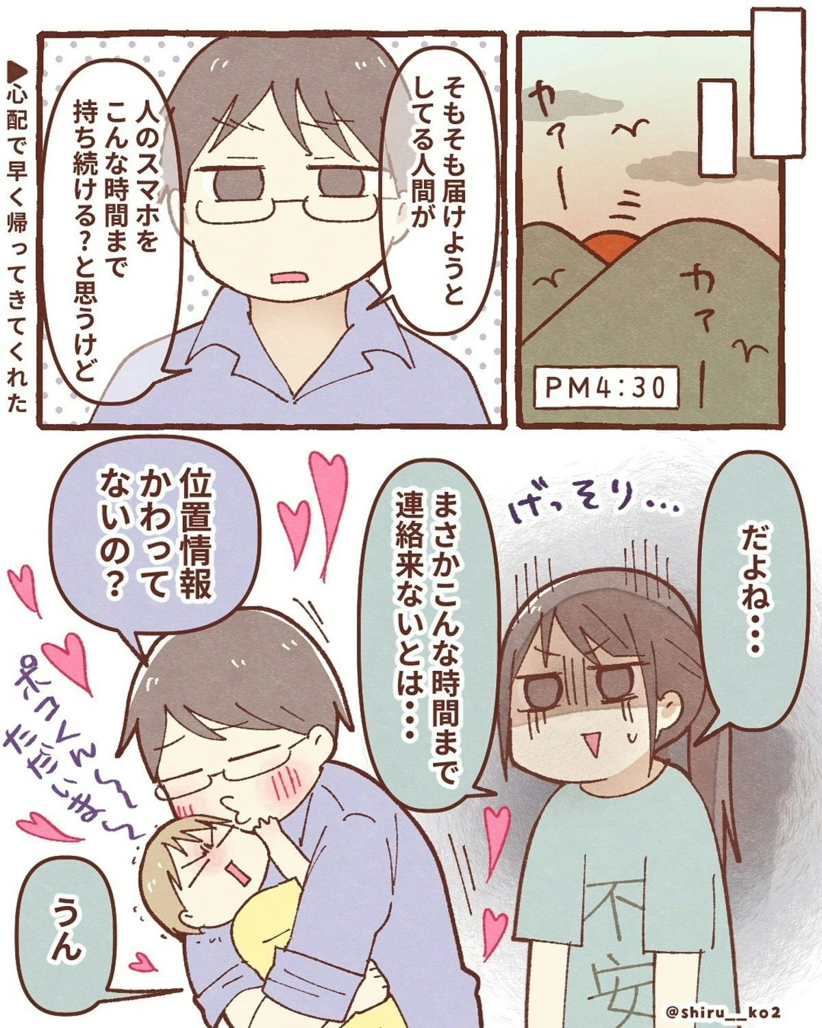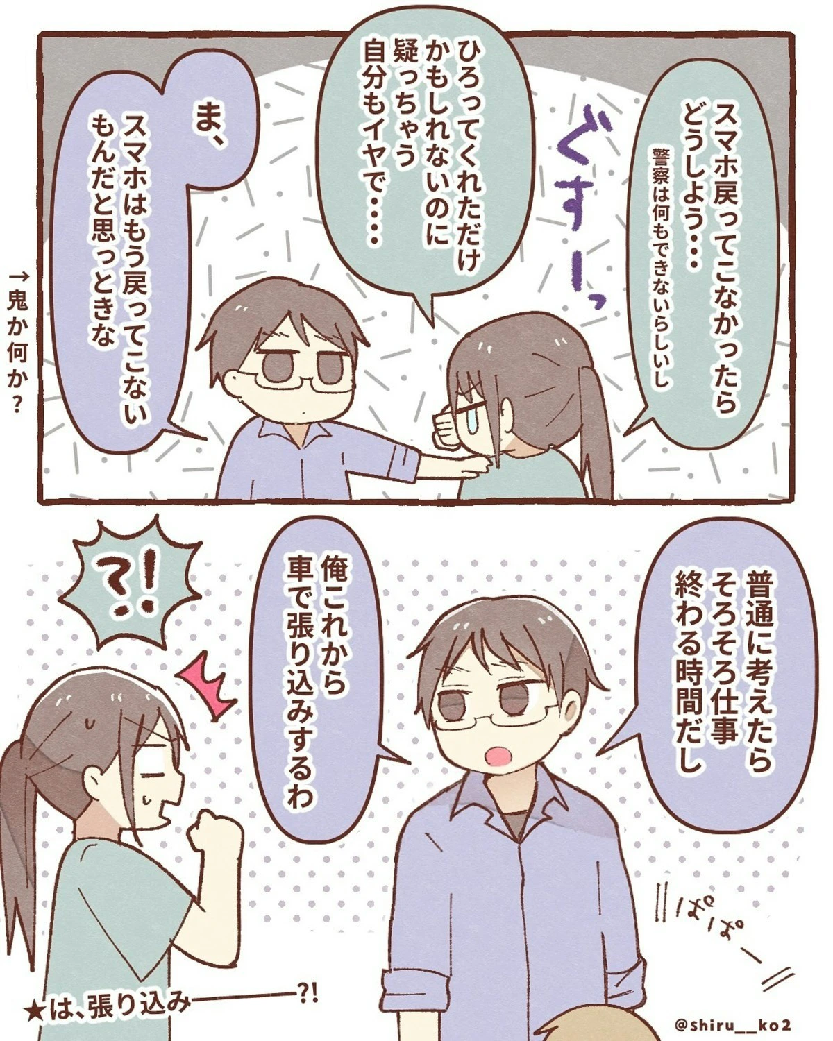 夕方になっても、しる子さんのスマホが戻ってくる気配はありません…。早めに帰ってきてくれた夫が、駐車場で張り込みをしてくれることに!無事に戻ってくるのを祈るばかりです。
