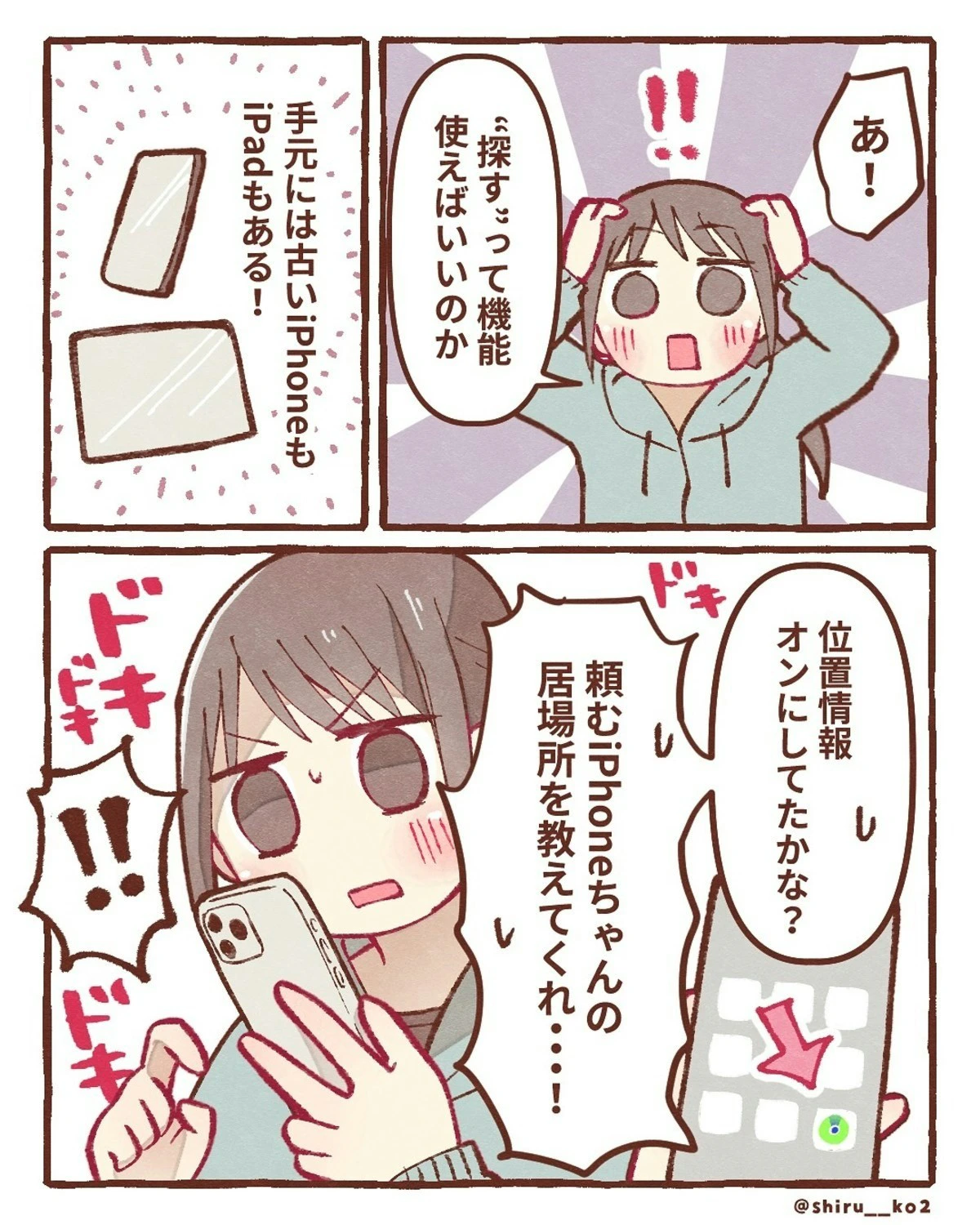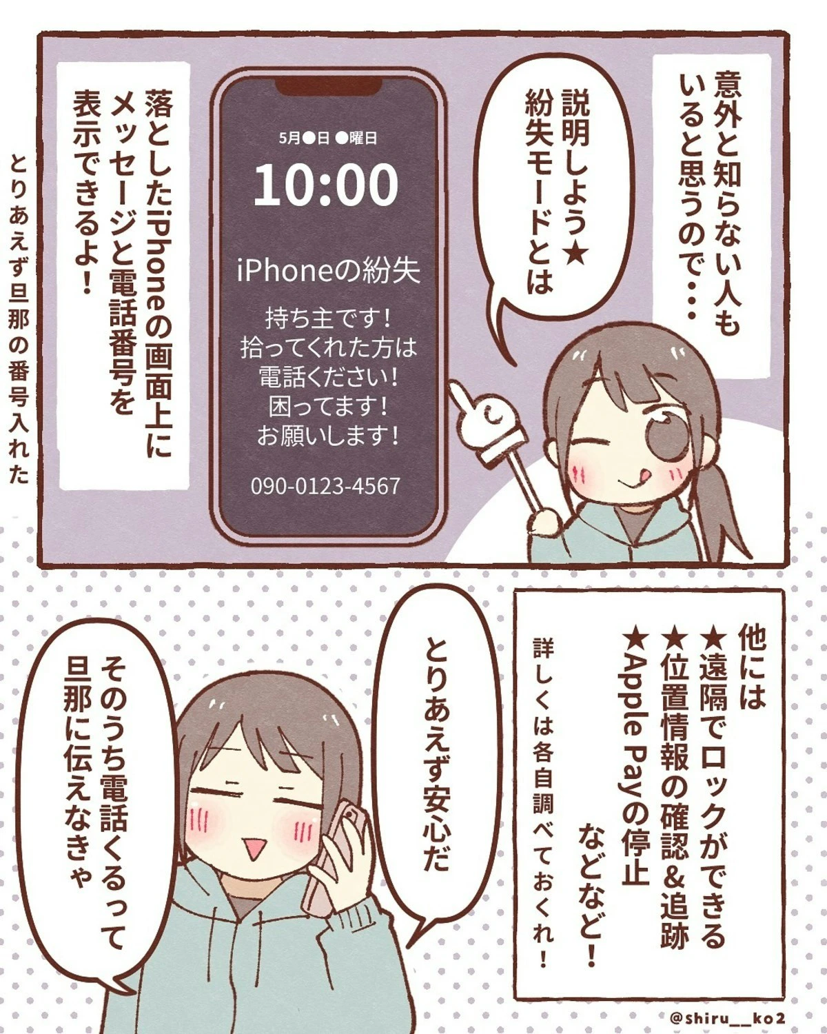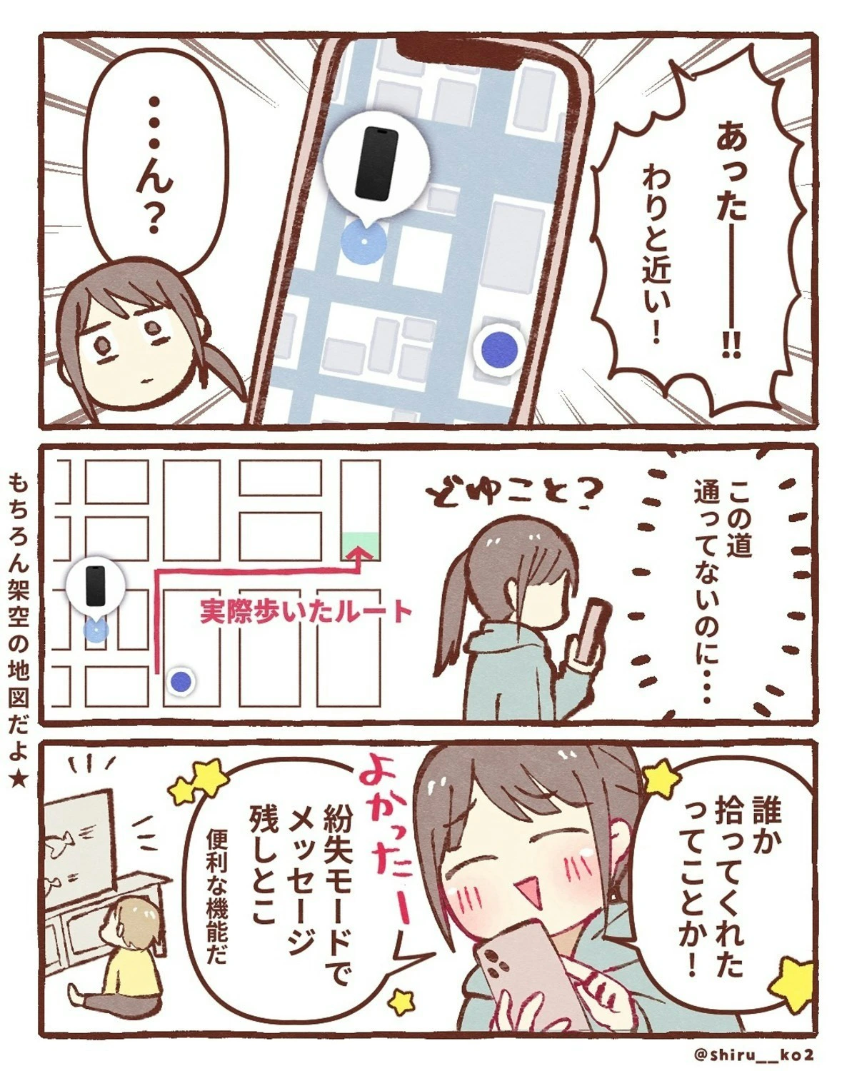 一度家に戻り、冷静に考えた しる子さんは、「iPhoneを探す」機能を駆使し、スマホの位置を特定します。さらに、紛失モードでメッセージを送ります。