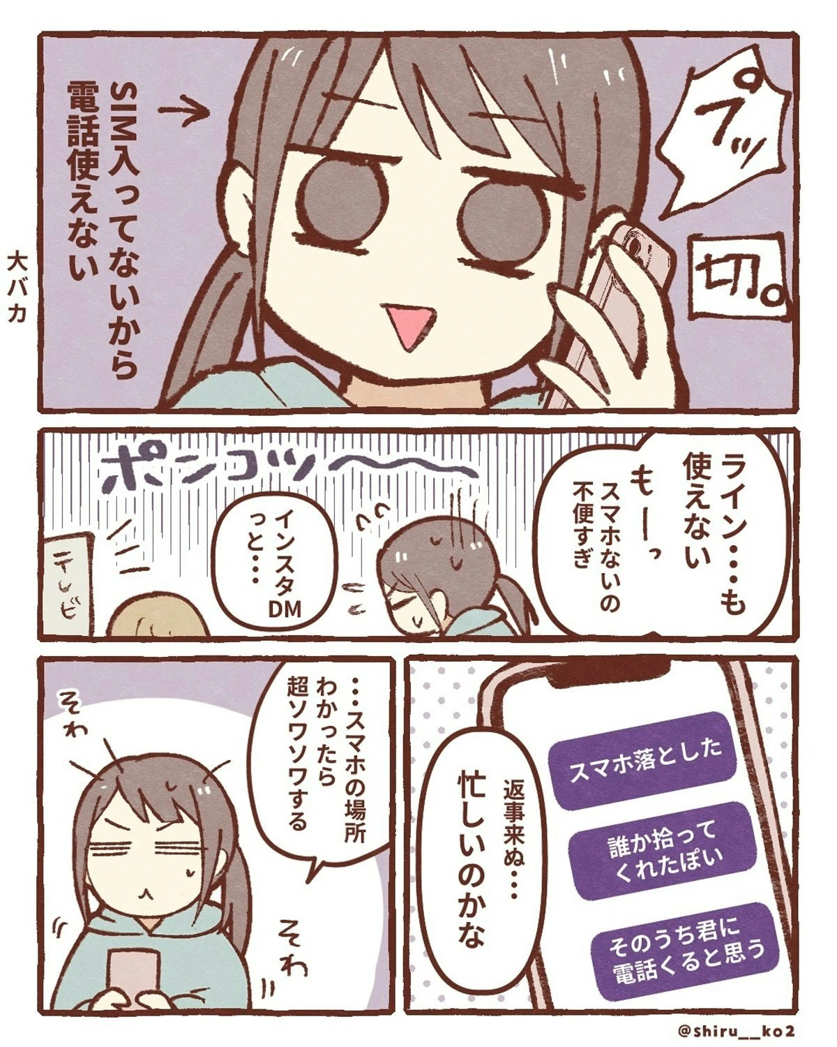 本作では、スマホを落としてしまい、誰かが拾ってくれたようですが連絡がつかず、ソワソワした様子が描かれています。現代人にとって、スマホが半日でも手元にないのは不安ですね。