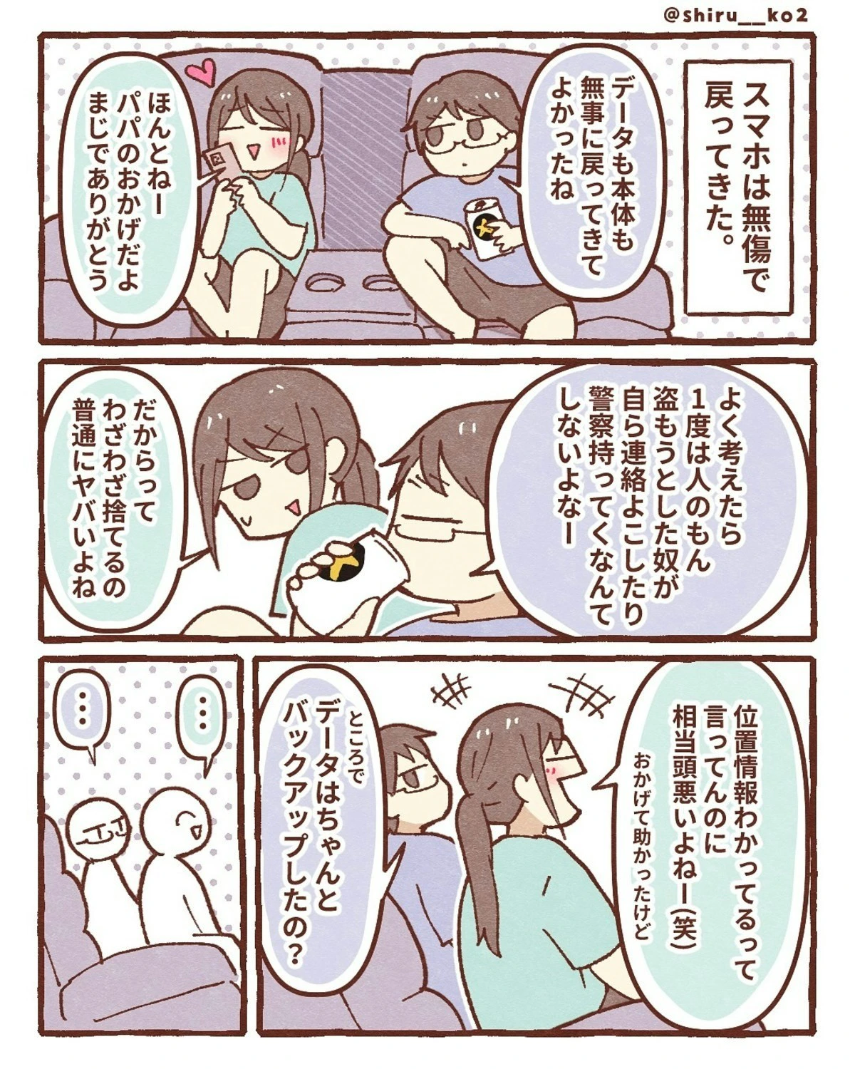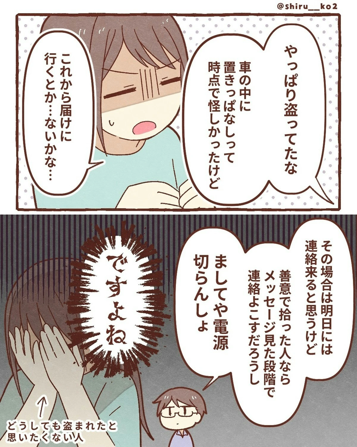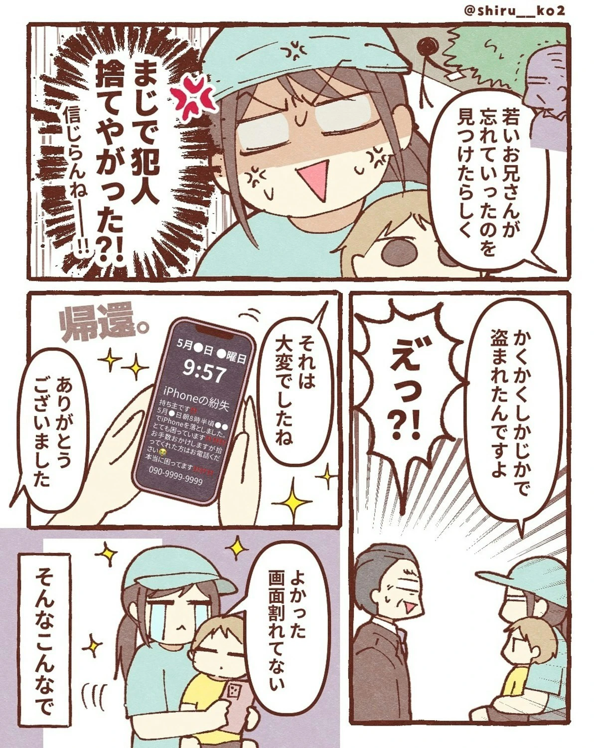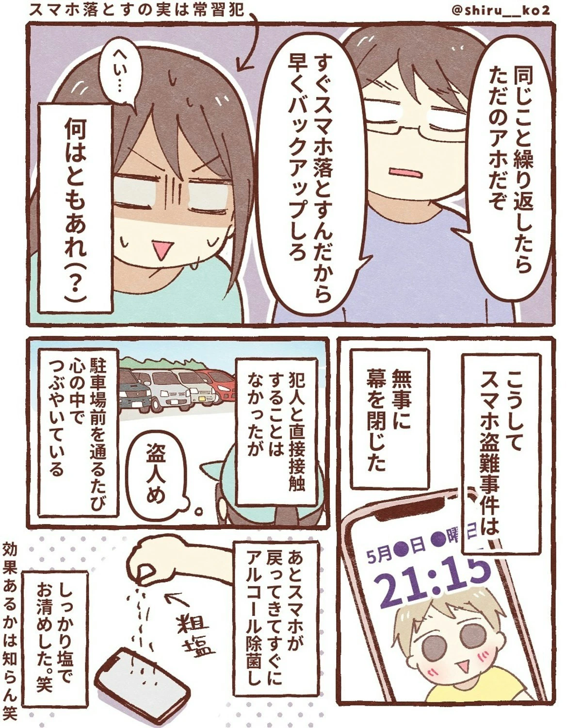 しる子さんのスマホ、無事に戻ってきて何よりでしたね。犯人がしたことは許せませんが、あの貼り紙が威力を発揮しようです。「知ってるよ、見てるよ」とプレッシャーをかけるのは、効果があるようです。