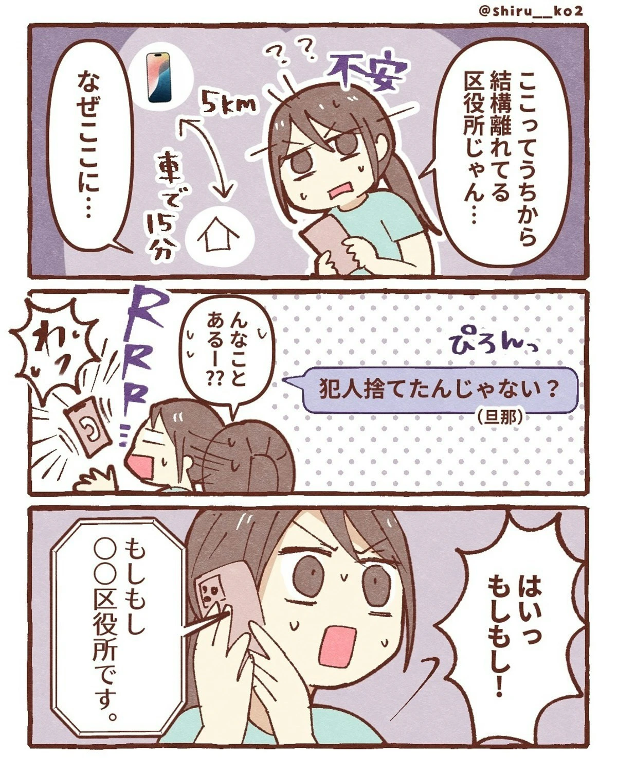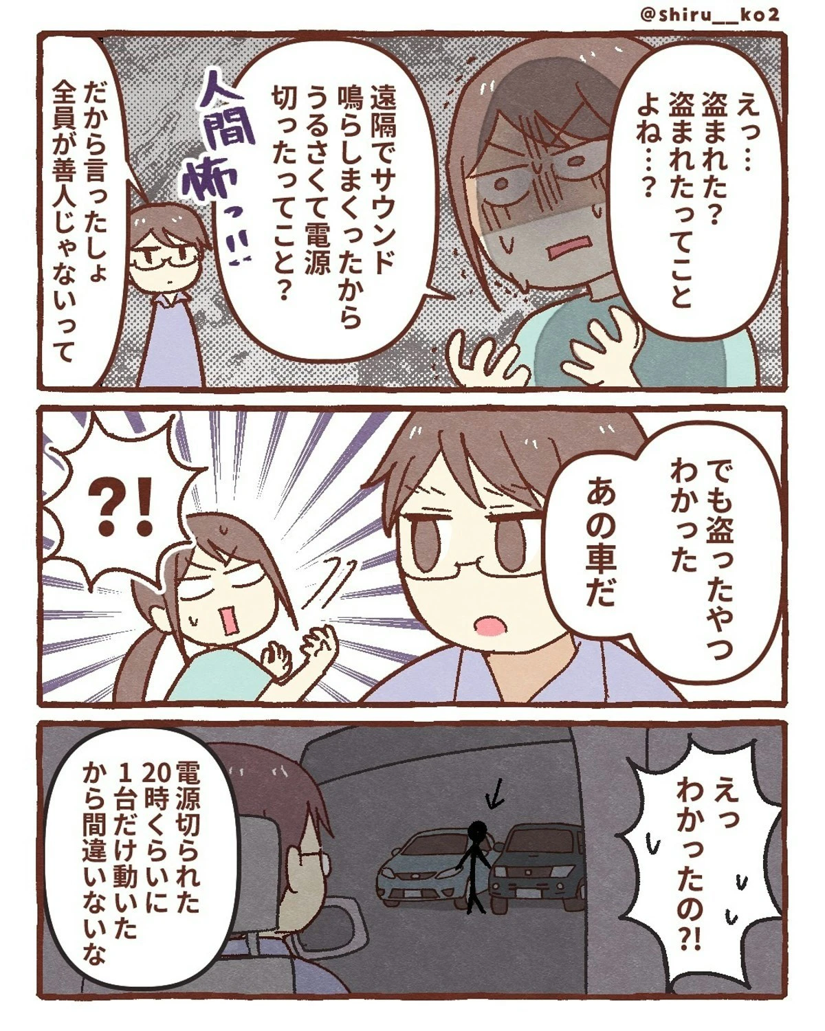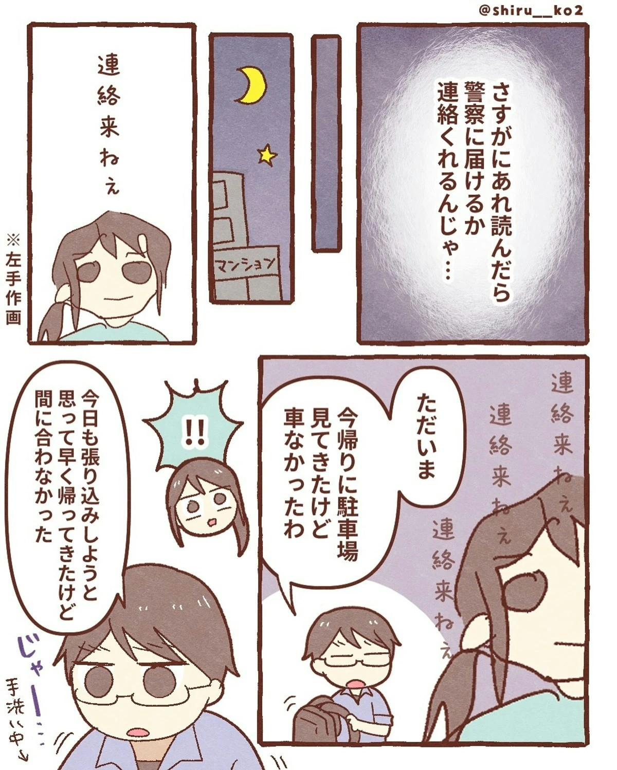 しる子さんが落としてしまったスマホを拾った人物、どうやら善意ではなかったようです。夫の張り込みのおかげで、スマホを拾った人物と車を特定することができました。