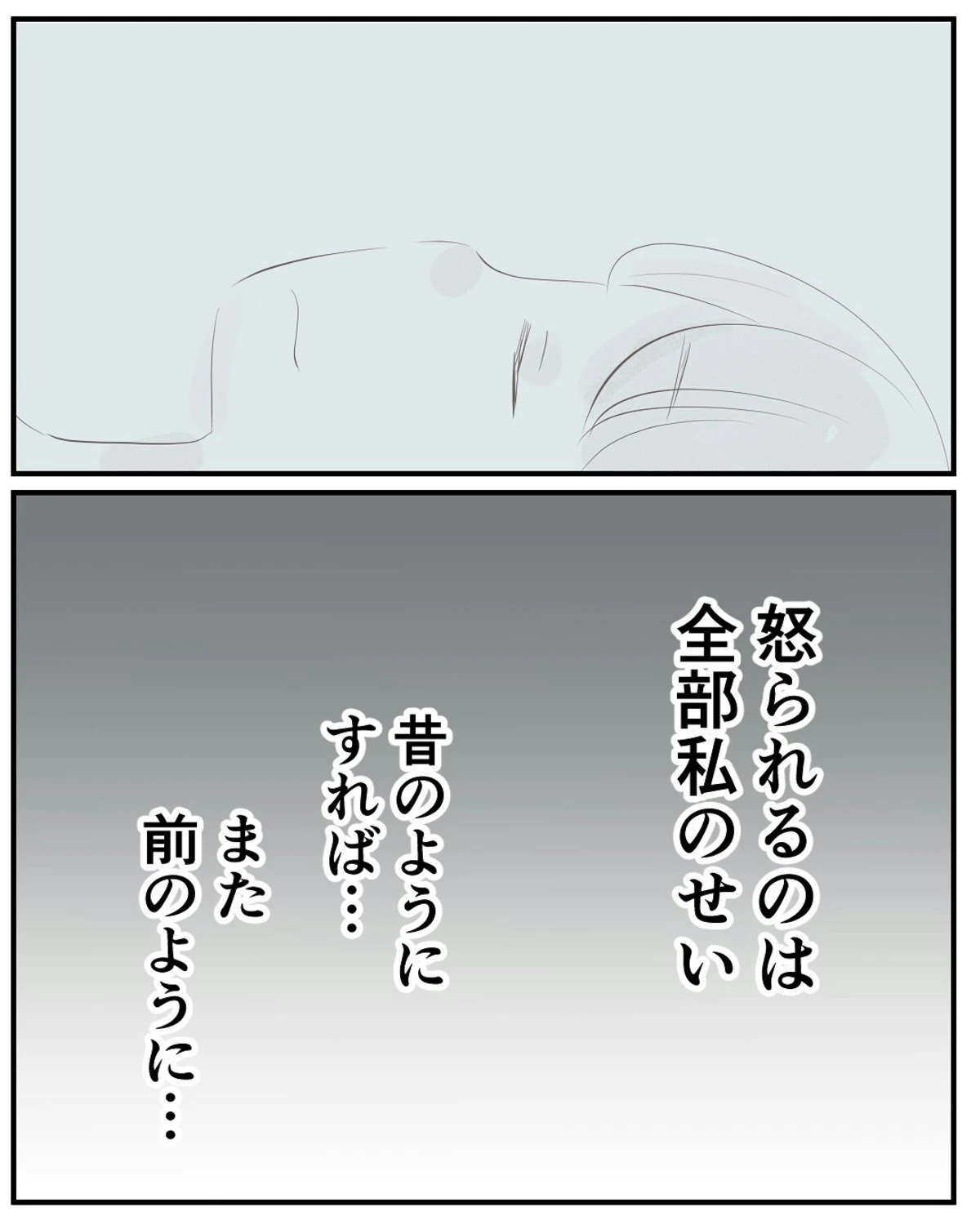 妊娠中という、心身ともに変化が大きい時期の夫の豹変、恐ろしいですね。さらに、妻を世間から孤立させ、徐々に夫の考えを押しつける手口は巧妙です。渦中にいるときは、被害者であると気づきにくいもの。一刻も早く異常さに気づき、夫の洗脳から抜け出すことを願うばかりです。