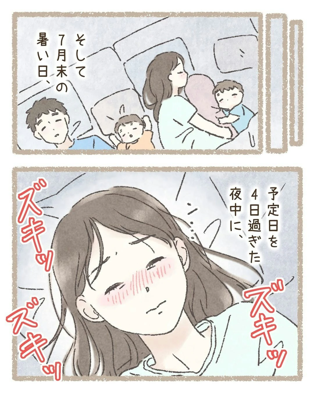 赤ちゃんは、わこさんのおなかの中ですくすくと育ちます。そして、予定日を過ぎたある日…。