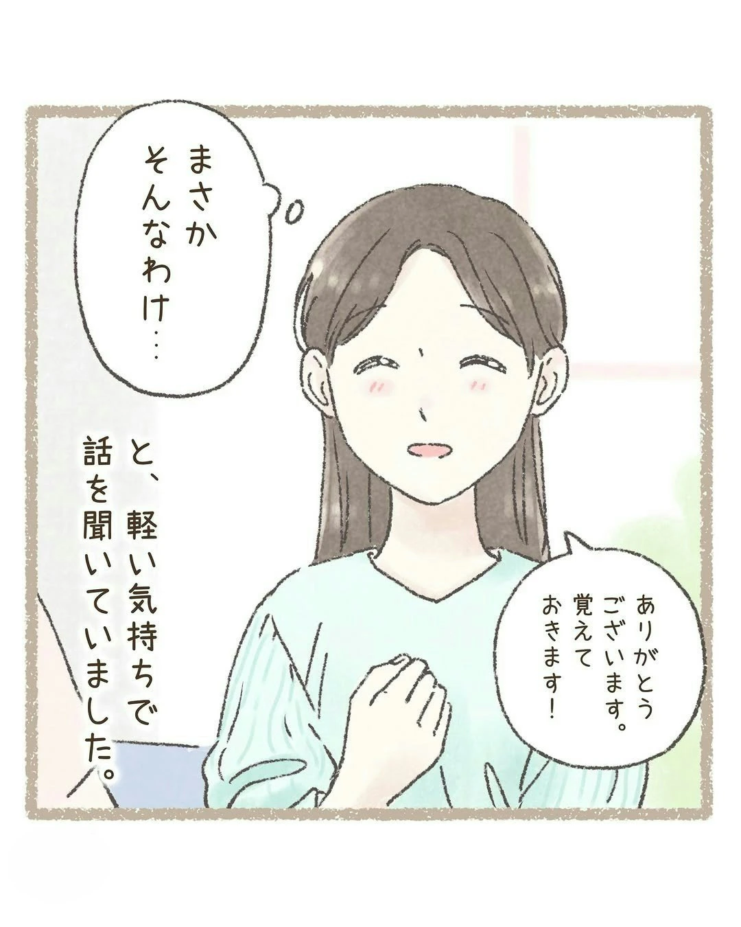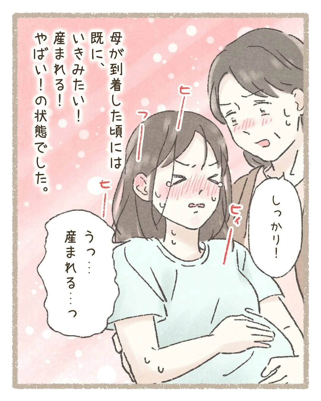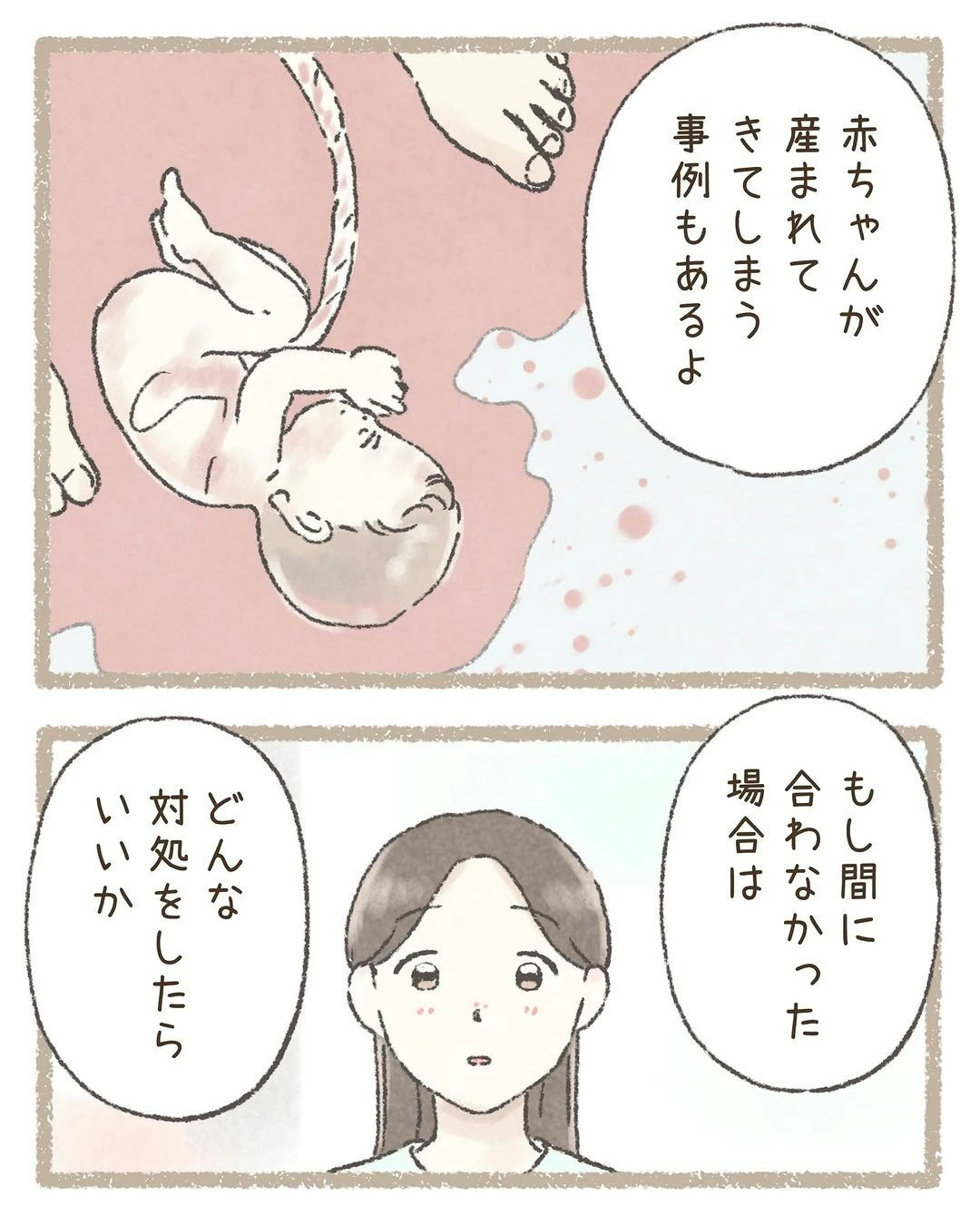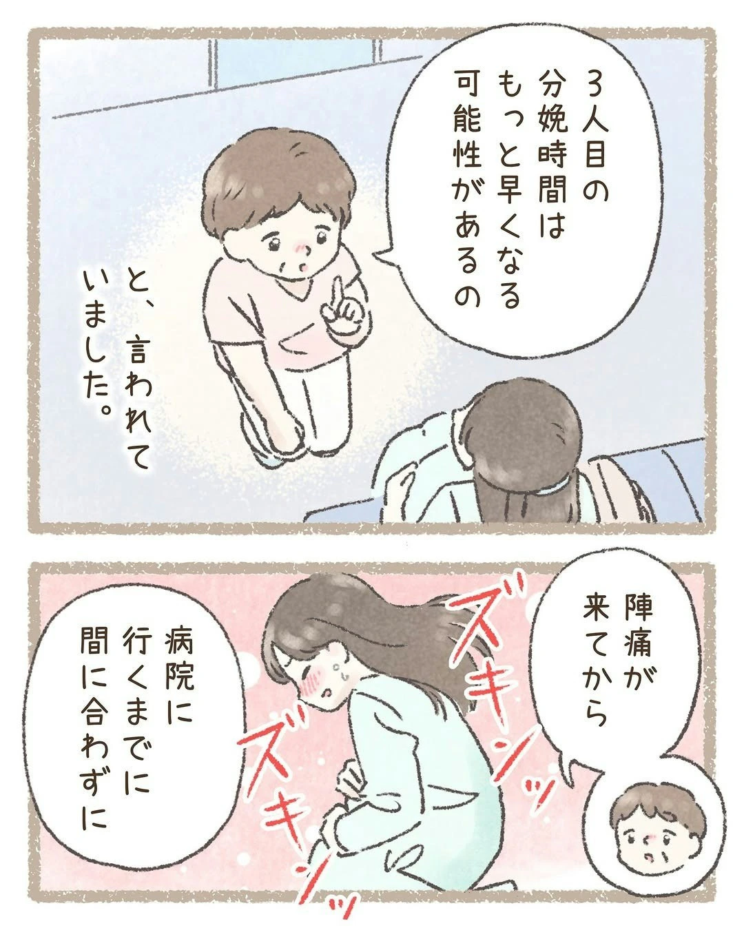 万が一に備え、わこさんは助産師さんから出産のアドバイスを授かります。このときは、「まさか自分が」と軽い気持ちで話を聞いていたそうですが、実践しなければいけない場面が訪れます…。