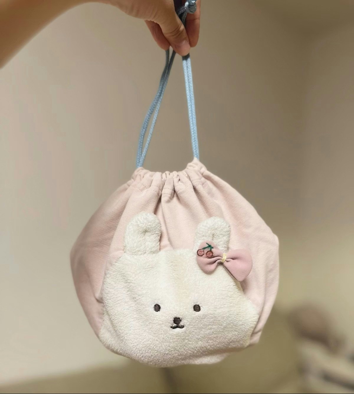 あまりのかわいさに、この巾着袋を作るために服が欲しくなってしまうほどでした!おしりに付いていたふわふわなウサギちゃんが、丸型の巾着袋によってかわいらしさが増していますね。ひもの色やリボンでアレンジするのも楽しみに。