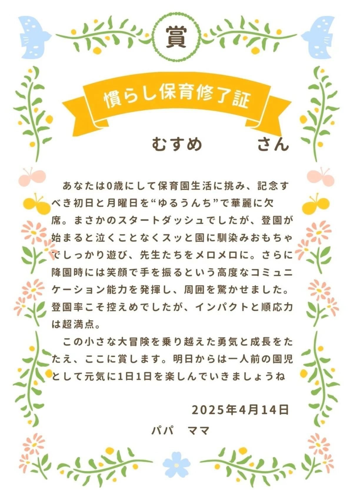 「慣らし保育修了式」の発想は秀逸すぎますね。とってもステキなご両親の元に生まれた娘さんは、幸せ者ですね。また、最後の「明日からパパもママもお仕事頑張ります!」の一文も、世の中のママ、パパにとっては共感の嵐でしょう。かわいい我が子がいるからこそ、毎日仕事も家事も頑張れるのです!