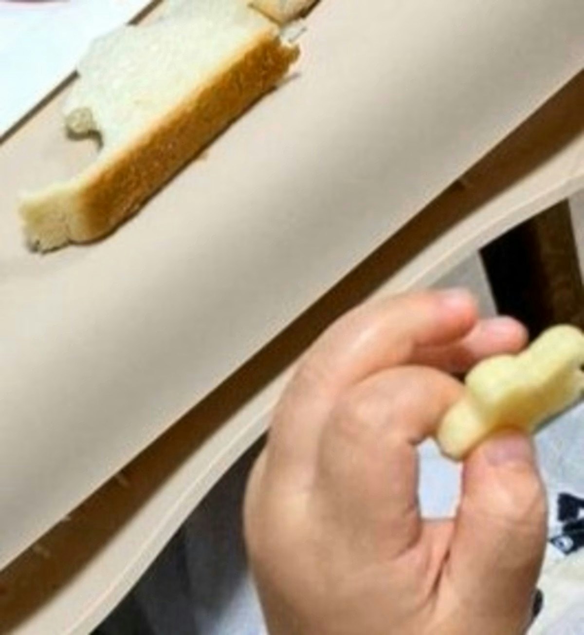 2歳児の遊び食べがすごいのでじゃあもういいよ思いっきり遊ぼうよ!!!と思ってプラスチックまな板とクッキーの抜き型買った😄1食で食パン1枚とスライスチーズ2枚とりんご1/3食べた😄型抜いたあとの残りの部分も自分で食べてた!笑 ※1