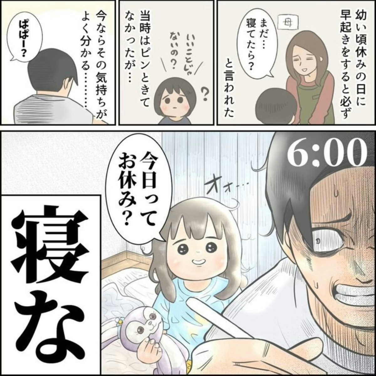 休みの日の朝6時に「今日ってお休み?」と目を輝かせてニコニコしながらたずねてくる娘さん。その無邪気さとかわいさと同時に、「まだ寝ててくれ~~!」という親の心の叫びが、絶妙なギャップで描かれています。