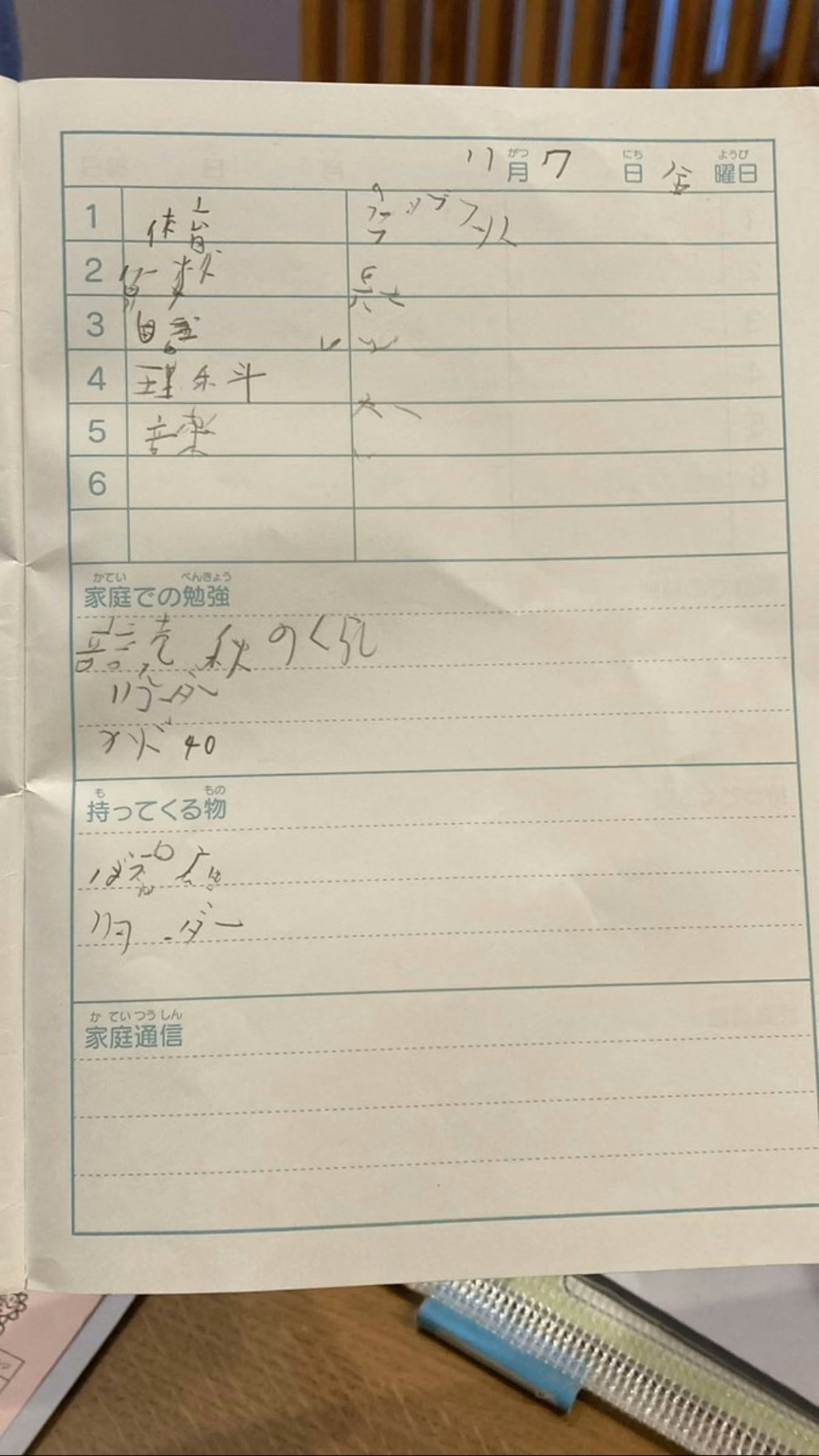 ほたる(@64hotaru64)さんの投稿です。ある日、ほたるさんは息子さん(小学3年生)が書いた予定帳を見ていました。「持ってくる物」の欄には、ちゃんと「リコーダー」と書かれていたのですが……その上にある文字がなかなか読めない…