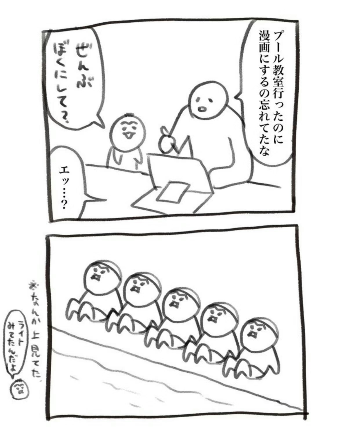 犬犬(@inu_eat_inu)さんの投稿です。育児漫画を描く犬犬さんは、「先日のプール教室の話、漫画にしてなかったな…」と、ある日ふと思い出しました。さっそくペンを走らせようとしたそのとき、横から息子さんが放ったひとことが、面白すぎると話題になっています。