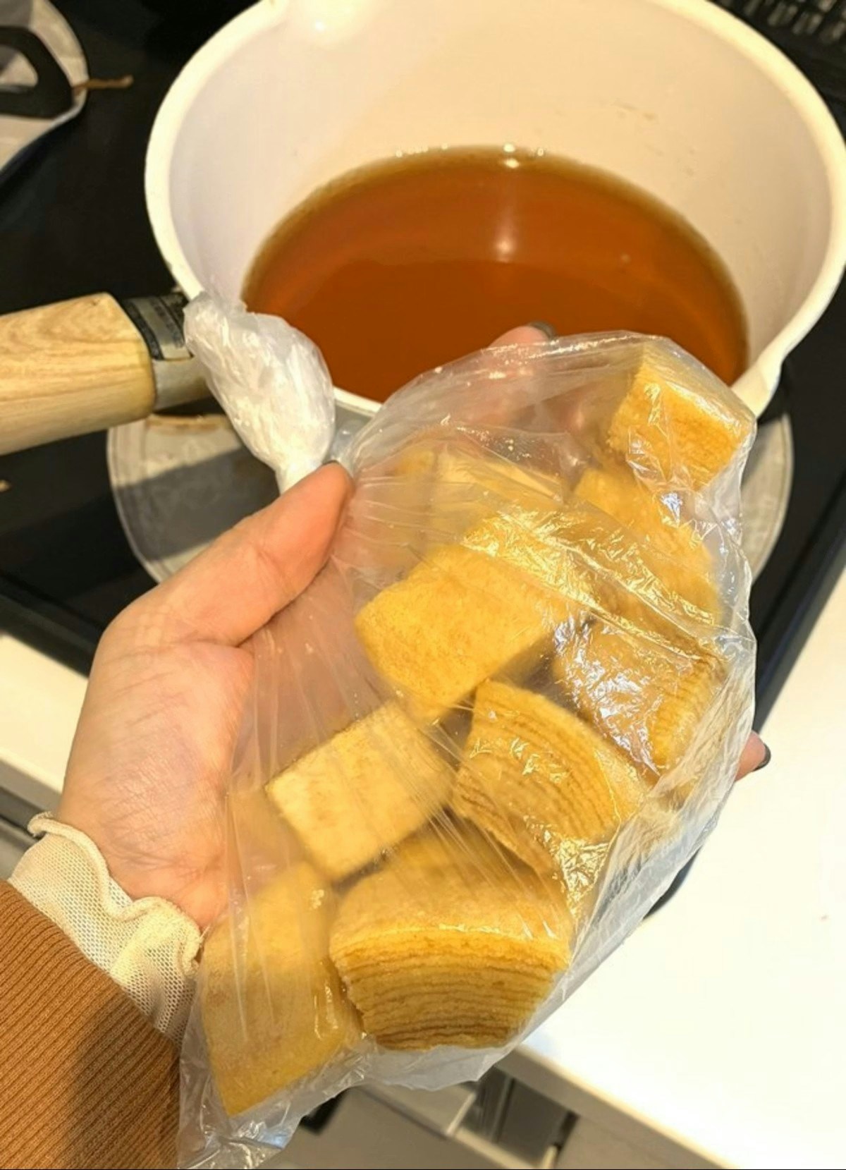 出てきたのは、まさかのバウムクーヘン。でも、きれいにカットされて袋に入れられた様子が完全に「厚揚げスタイル」。これは思わず吹き出しそうになりますね。透明な袋に入れられた厚揚げに見えるバウムクーヘンと、鍋にスタンバイしていた出汁の組み合わせが完全に厚揚げ調理の流れに見えます。
