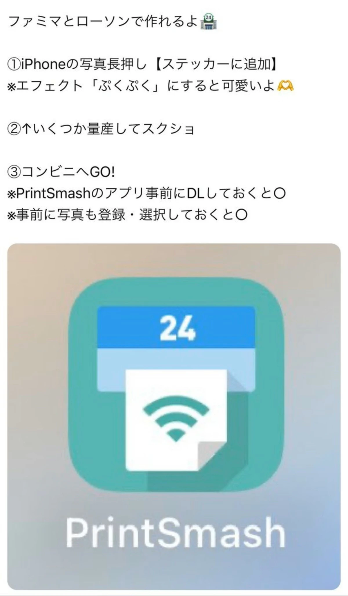 シールを作る際に使うものはスマホと「PrintSmash」というアプリのみ。ゆーひさんの場合はiPhoneの機能である「ステッカーに追加」を使ってシールにしたい写真を集めたようです。