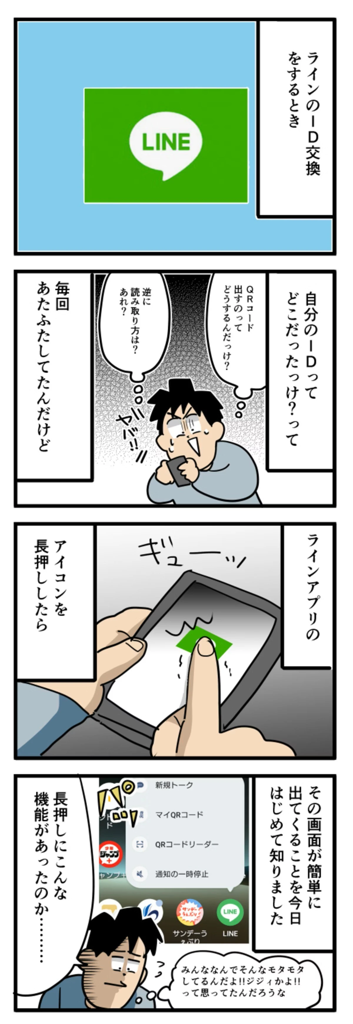 ご紹介するのは、ロッテンマイヤー@日記漫画(@y7LuoTv8SJ4eZrJ)さんの投稿です。説明書などが無い、あるいは簡略化され「どうやって使うの?」と、困ってしまうこともありますよね…。LINEのID交換に、毎回あたふたしてしまっていたロッテンマイヤーさん。ショートカット機能の気づきを日記漫画にし、有益な情報に注目を集めました。